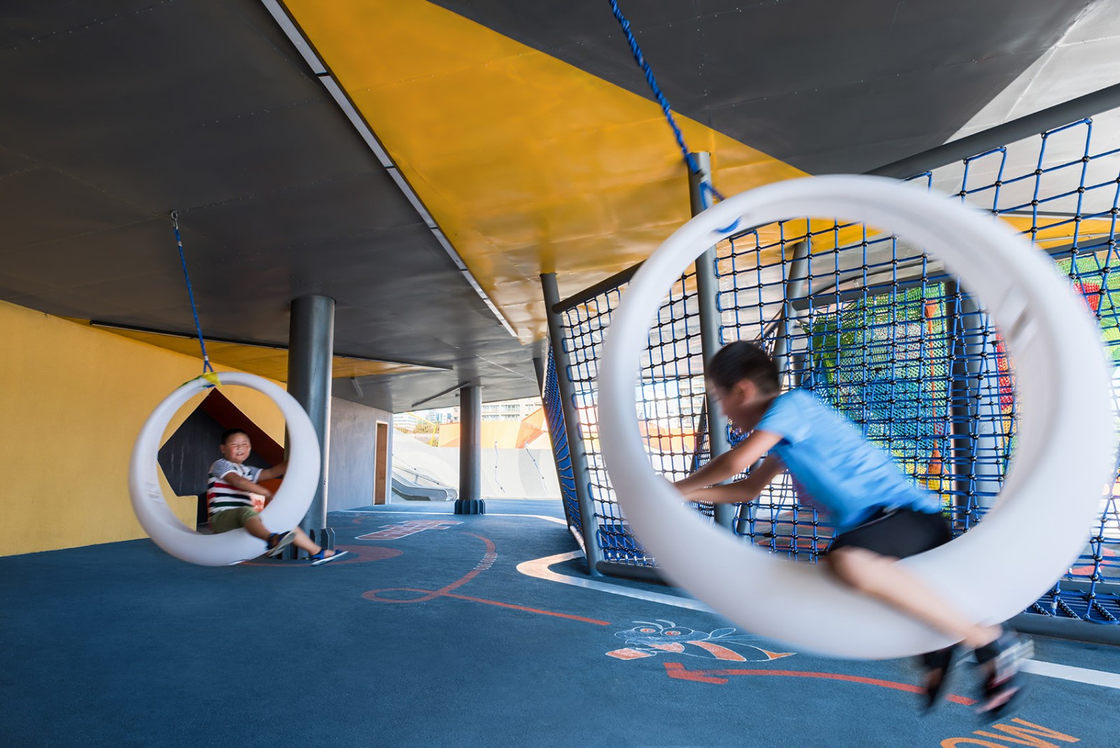 重力塔、重力拉索、體重吊環(huán)等多種與重力相關(guān)的力學(xué)游戲器械,讓孩子們體驗(yàn)失重、超重、離心力、向心力、自由落體、能量轉(zhuǎn)換,摩擦力等各種力學(xué)知識(shí)的存在。我們甚至還嘗試通過漩渦狀的鋪裝及特定的體驗(yàn)點(diǎn)模擬引力場的感受,將這類高深的知識(shí)也變得直觀可以體驗(yàn)。