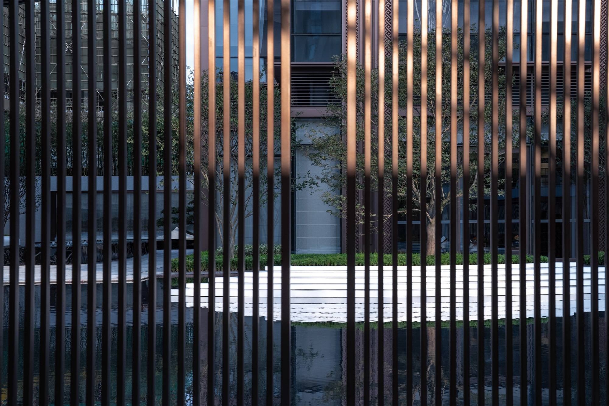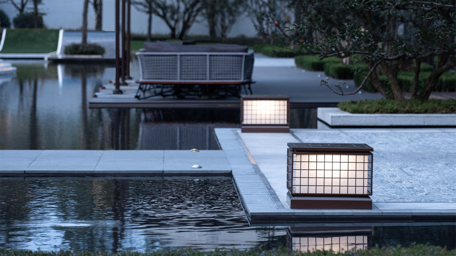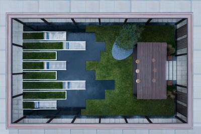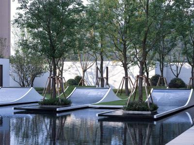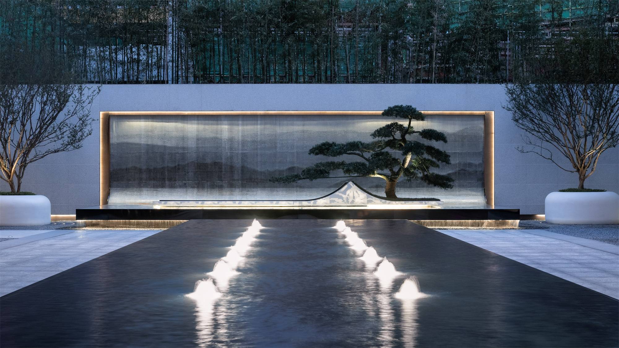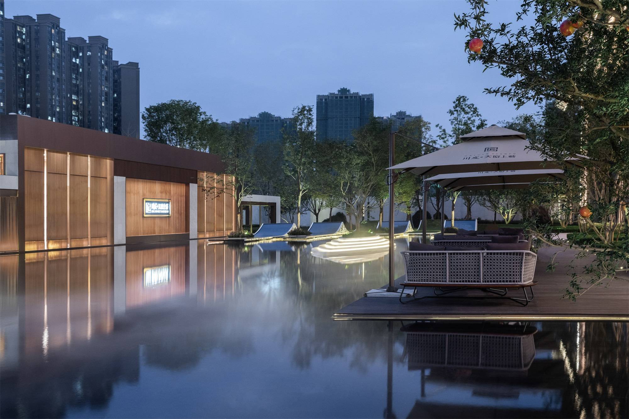 行至水院、覓得一路曲徑蜿蜒延伸至水面,下行跌水潺潺、兩側(cè)疏影橫斜,層層水霧彌漫其間、點(diǎn)點(diǎn)星光碎在一池鏡水之上,微風(fēng)拂過掀起一池水紗、光影搖曳讓人仿若置身于碧波蕩漾、煙雨如畫的江畔湖邊;穿過一池水霧來到水岸休憩平臺,座座陽傘沙發(fā)給觀者以閑坐之處、小憩之地。