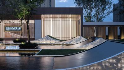 入口空間呈帶狀,有開敞的展示面與昭示性。大門造型與售樓部形式呼應(yīng),風(fēng)格同時延伸“中為魂,西為現(xiàn)”的表現(xiàn)手法,寓意上同售樓部主題一致,為揚(yáng)帆起航的帆船。