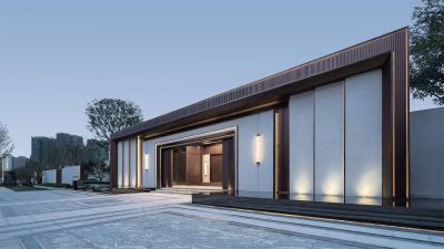 入口大門形式與建筑形式相呼應(yīng),運(yùn)用中式骨魂,外形與建筑的造型相似,但是做法與材質(zhì)運(yùn)用現(xiàn)代打造手法,以大面積的玻璃墻結(jié)合寓意碼頭棧道的木格柵成為部分展示體。在寓意上它同售樓部主題一樣,都為揚(yáng)帆起航的帆船,從這里出發(fā),尋找最美的生活。