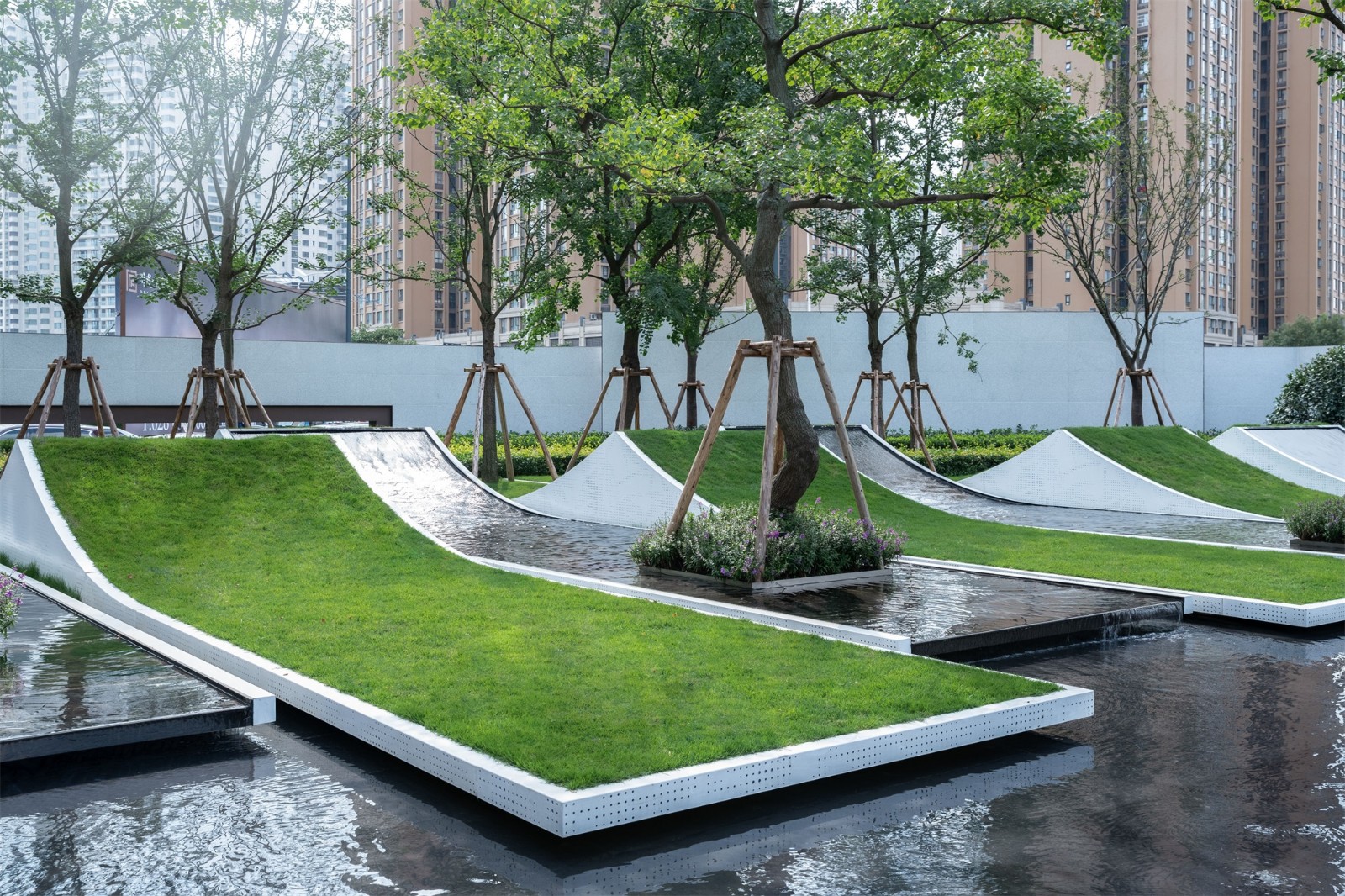 整個場景以大塊面水景為主展現(xiàn)府河“行船”文化,兩側(cè)通過拱起草階造型與流水的結(jié)合營造海浪的感覺,以樹池為“舟”,草階為“浪”,憑風(fēng)借勢營造出千帆洗盡滌塵新、萬舟歸來人益眾的盛大景象。