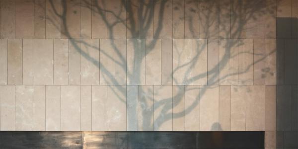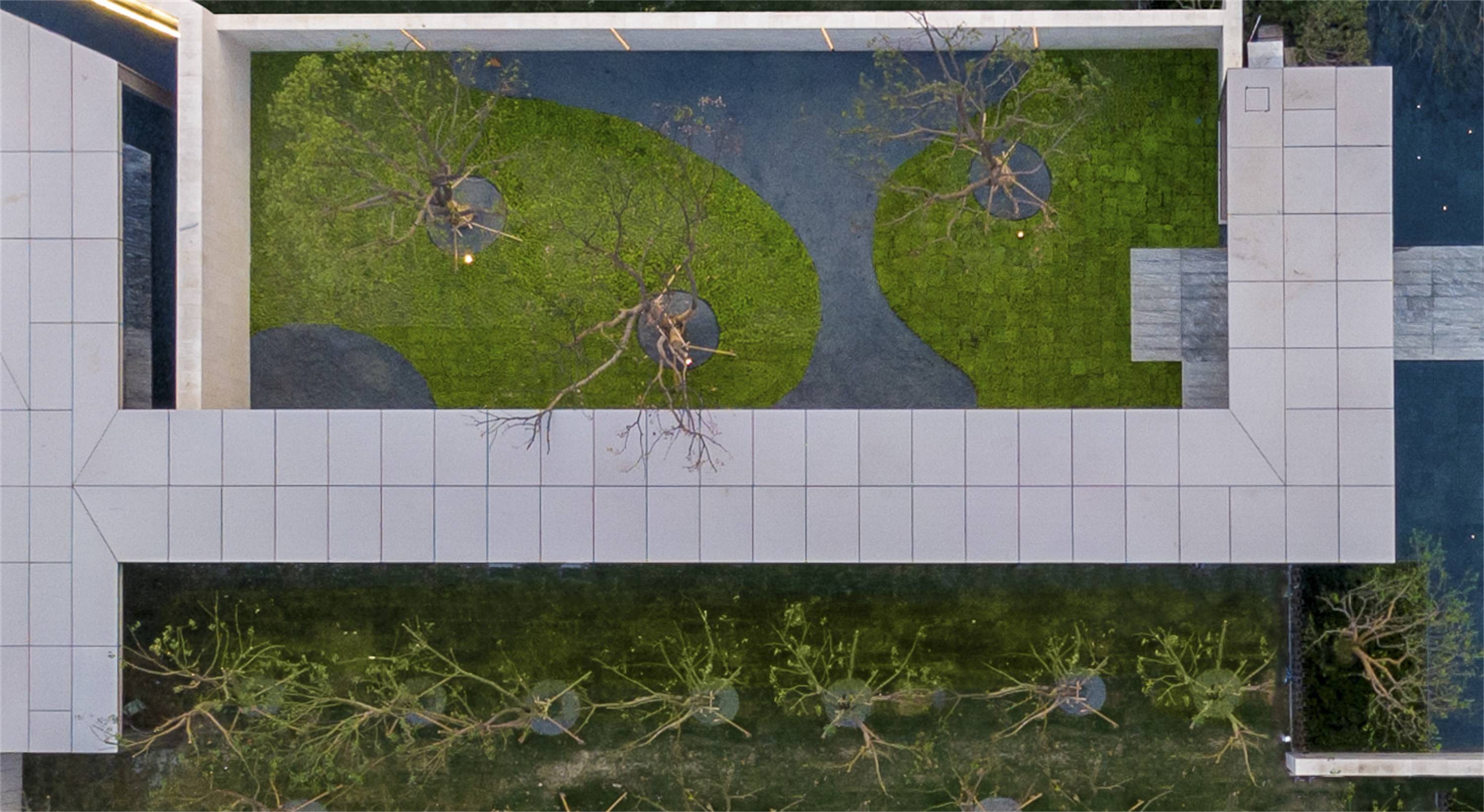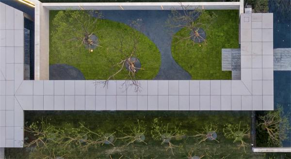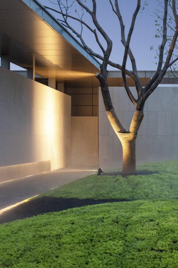 長(zhǎng)廊遵循空間秩序與規(guī)則,一側(cè)的一方庭院,草坡微凸,樹(shù)姿搖曳,樹(shù)影婆娑,萬(wàn)物歸于柔和,同時(shí)也打破空間的局限。午后漫步,于碾轉(zhuǎn)歲月中感受寂靜錯(cuò)落的詩(shī)意之美。
