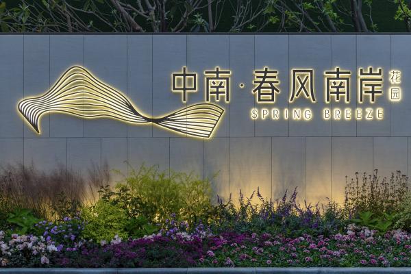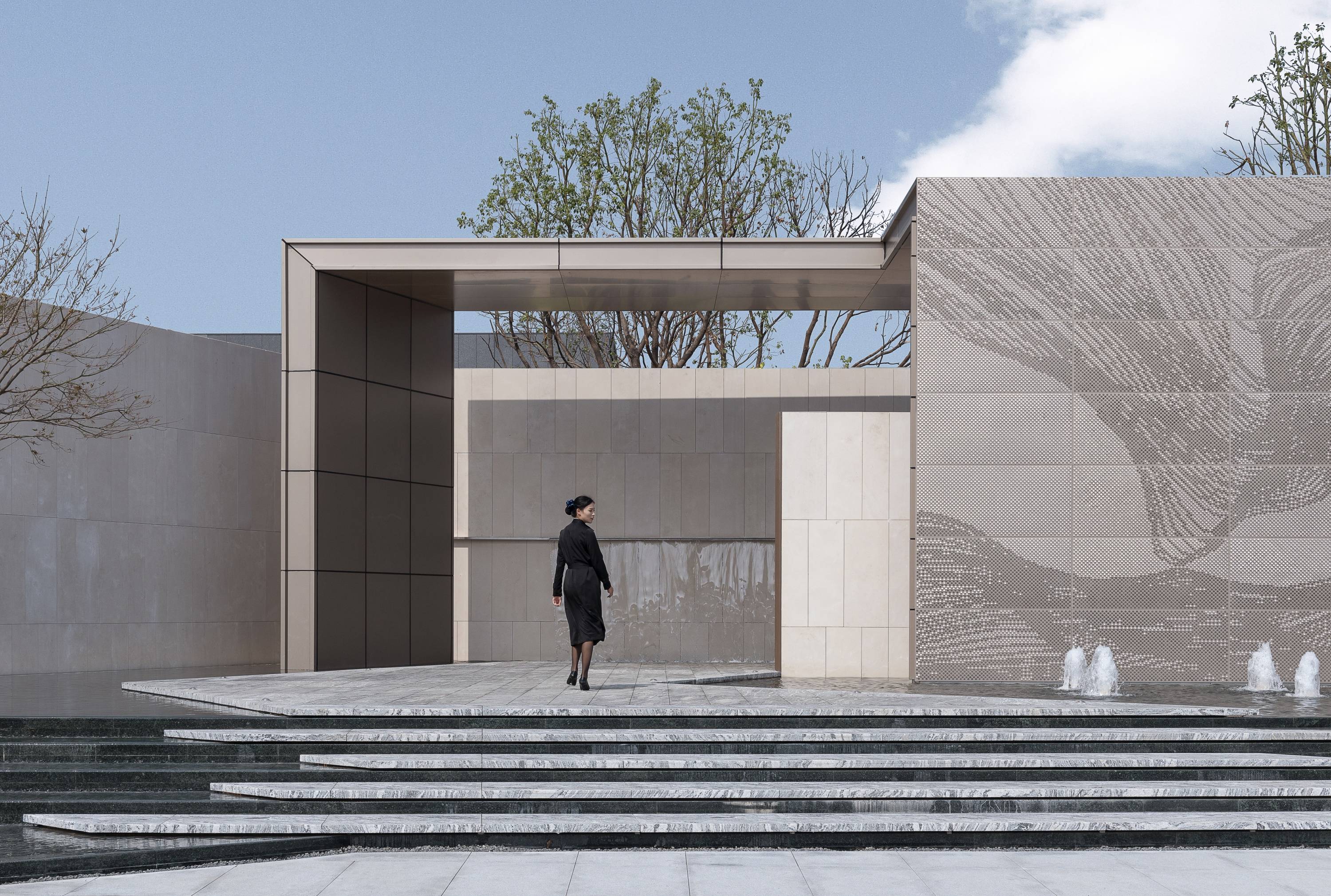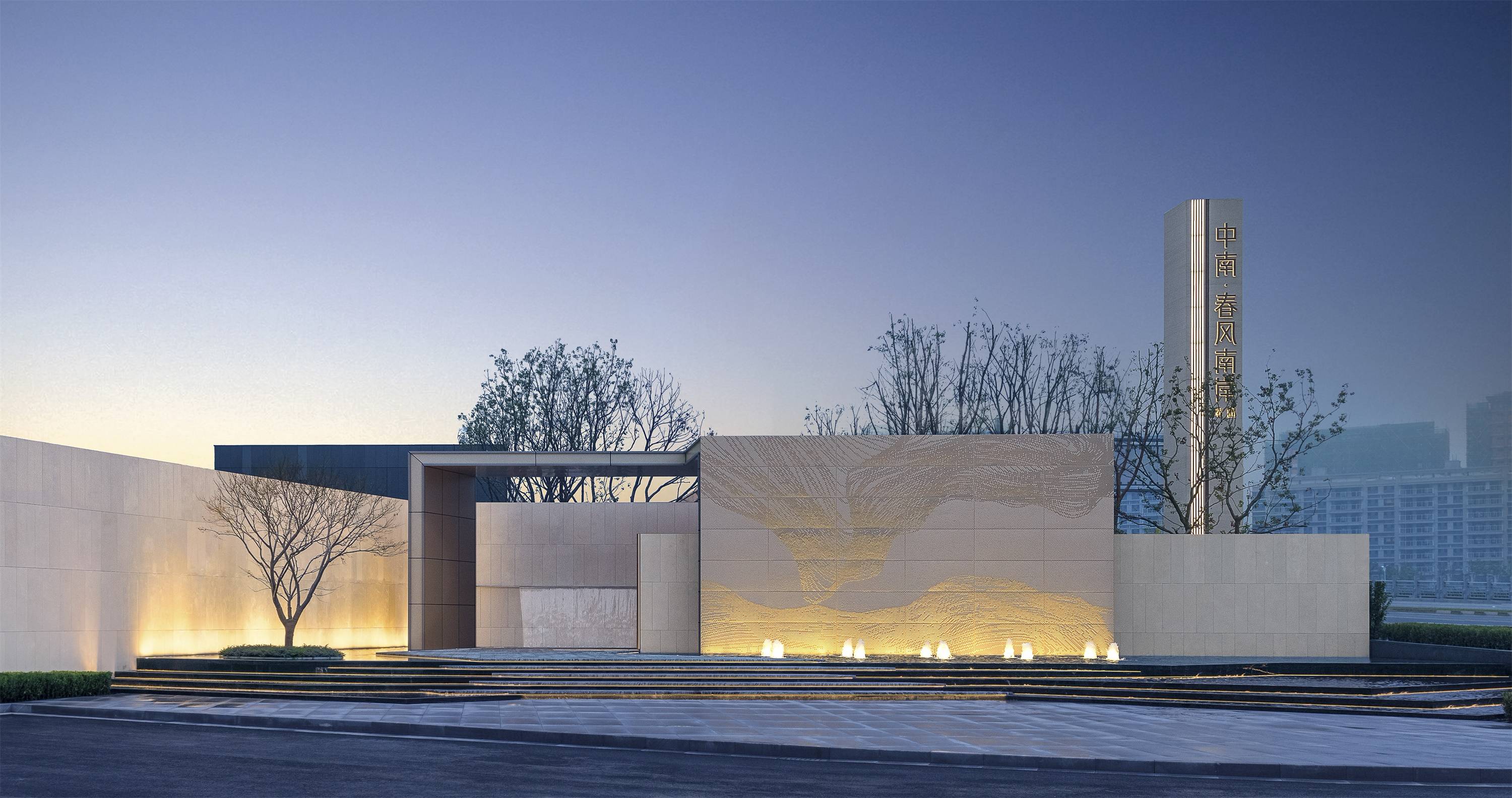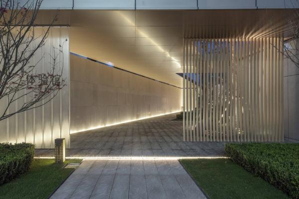 寬墻與綠植無(wú)形界定了場(chǎng)域感,屏蔽城市的喧囂,形成屬于春風(fēng)南岸的純凈一隅。顆粒鮮明的金屬內(nèi)開(kāi)外合,在片墻上以點(diǎn)帶線(xiàn),勾勒出柔和的曲線(xiàn),隨燈光飛舞,為硬朗的空間增添了一絲柔和。片墻素凈,自然作為點(diǎn)綴,洗去城市的煙火氣息。
