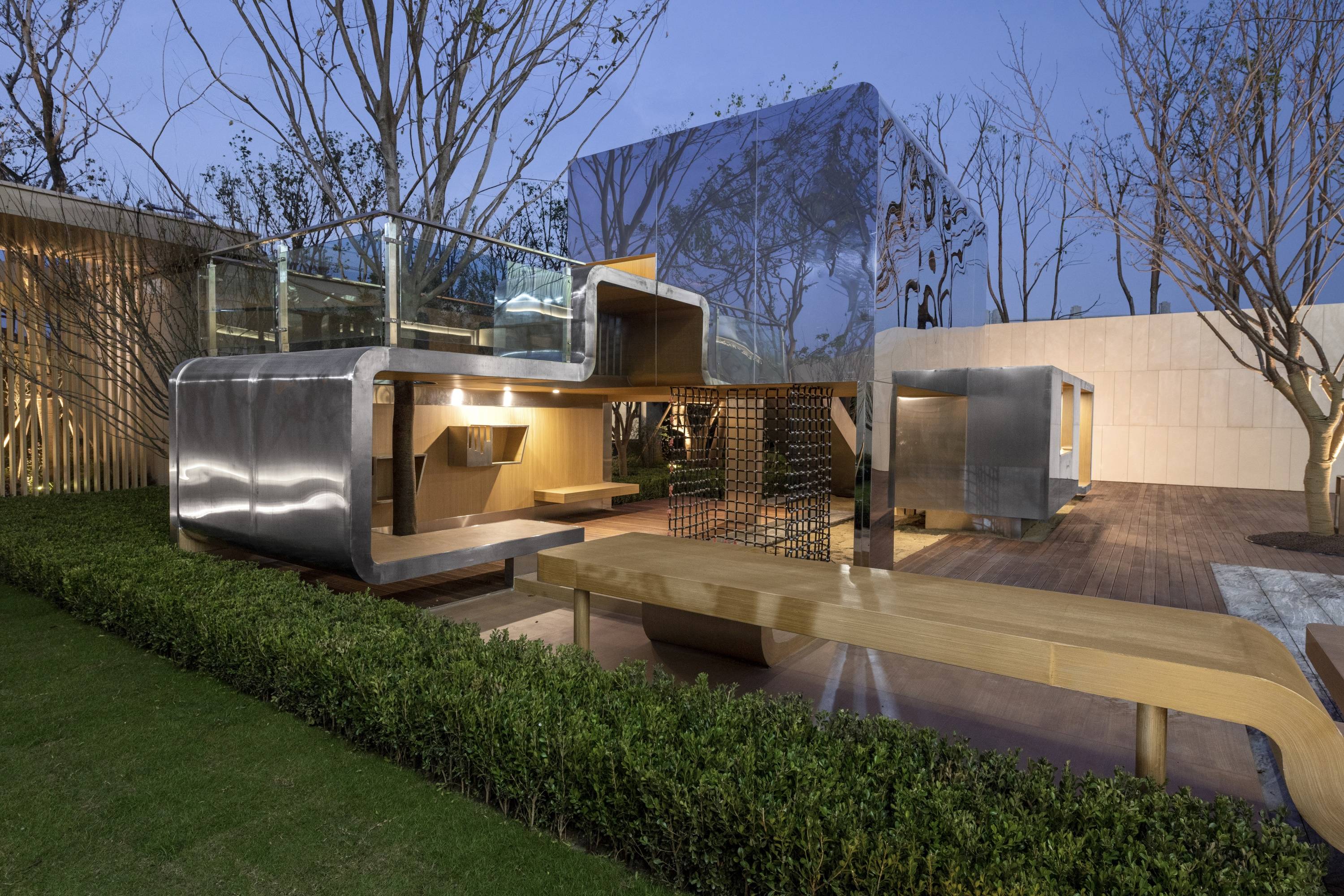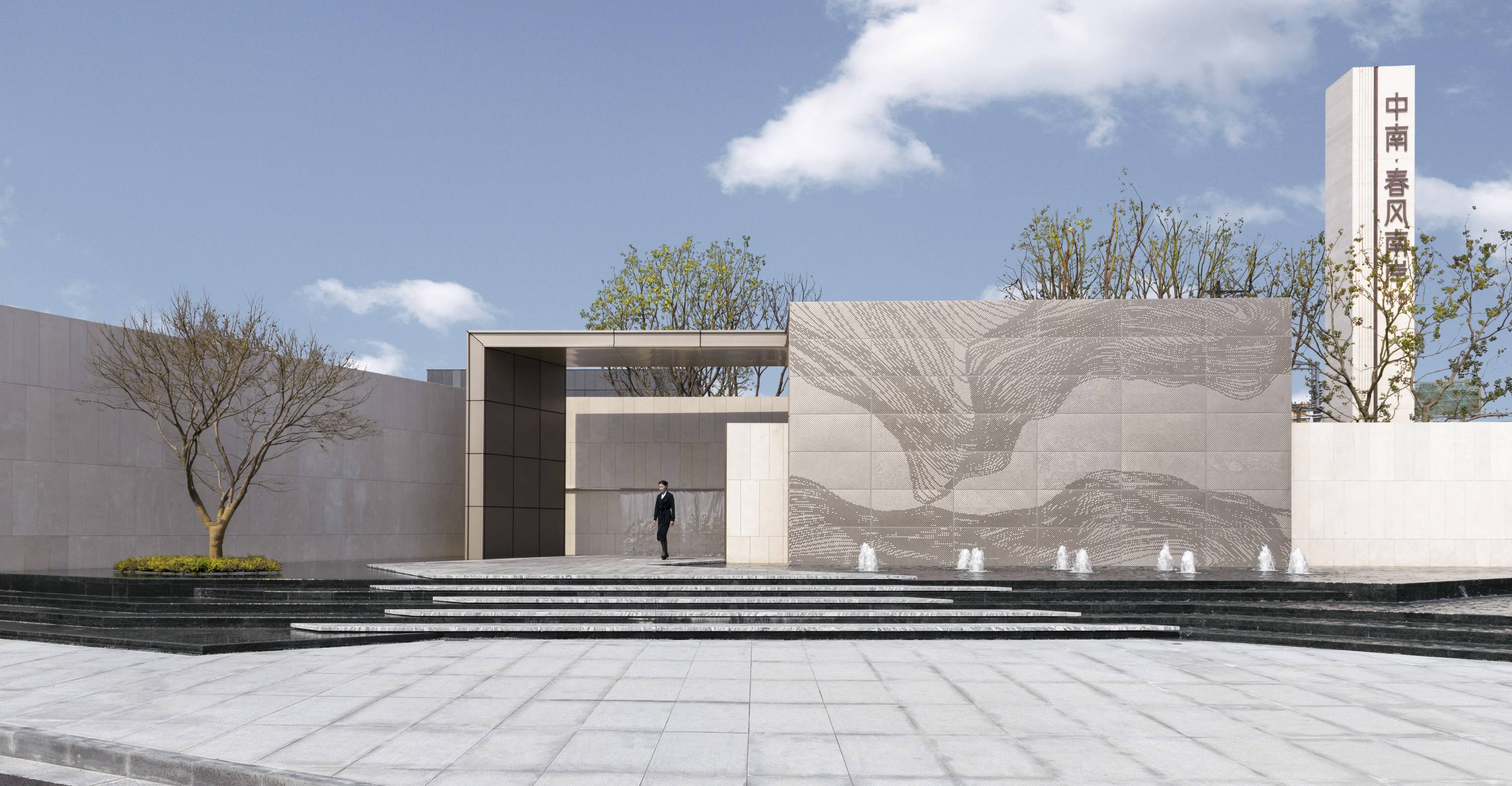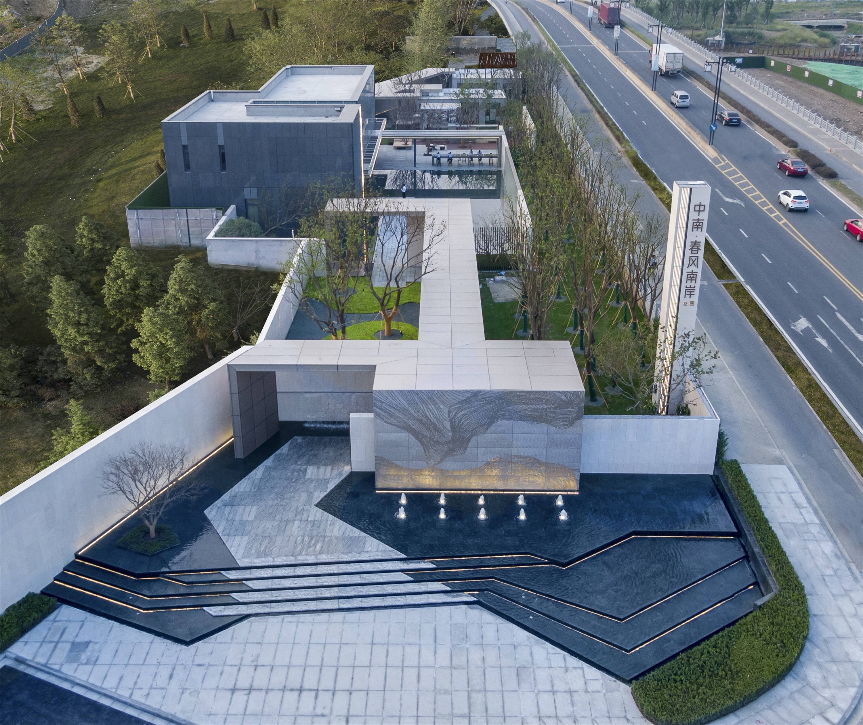 寬墻與綠植無(wú)形界定了場(chǎng)域感,屏蔽城市的喧囂,形成屬于春風(fēng)南岸的純凈一隅。顆粒鮮明的金屬內(nèi)開(kāi)外合,在片墻上以點(diǎn)帶線(xiàn),勾勒出柔和的曲線(xiàn),隨燈光飛舞,為硬朗的空間增添了一絲柔和。片墻素凈,自然作為點(diǎn)綴,洗去城市的煙火氣息。