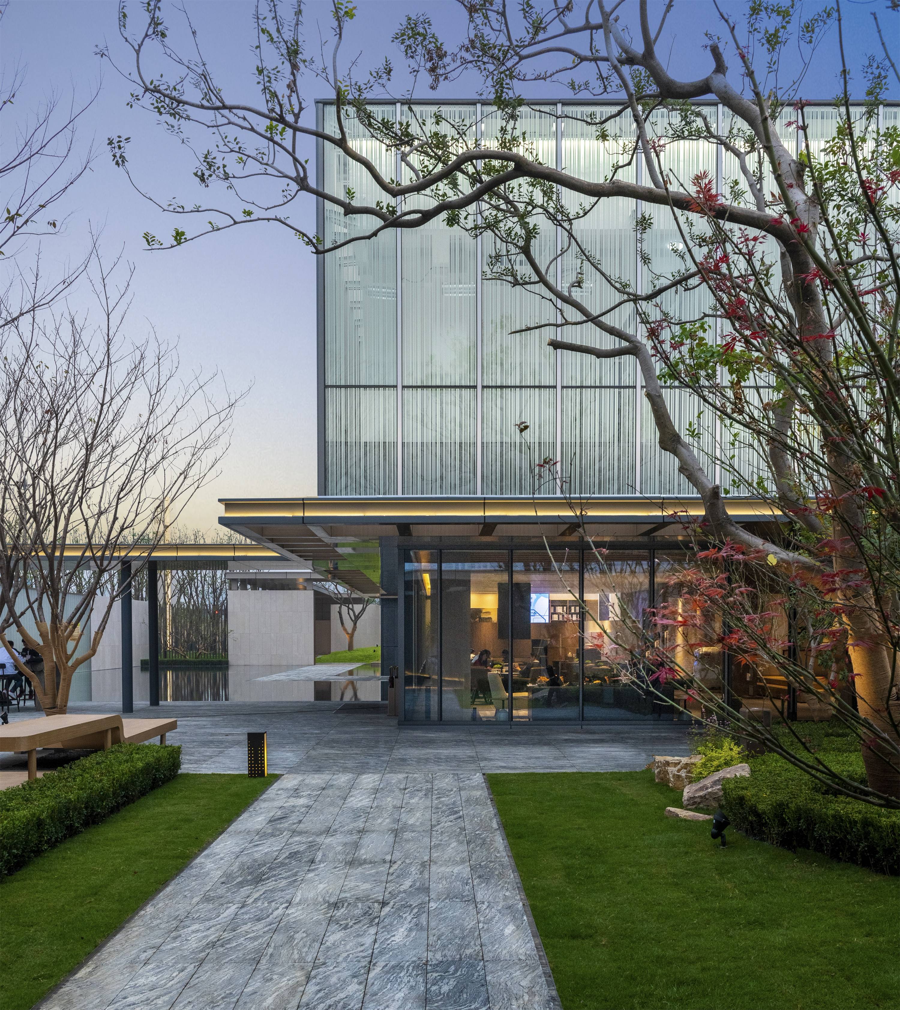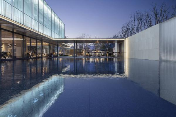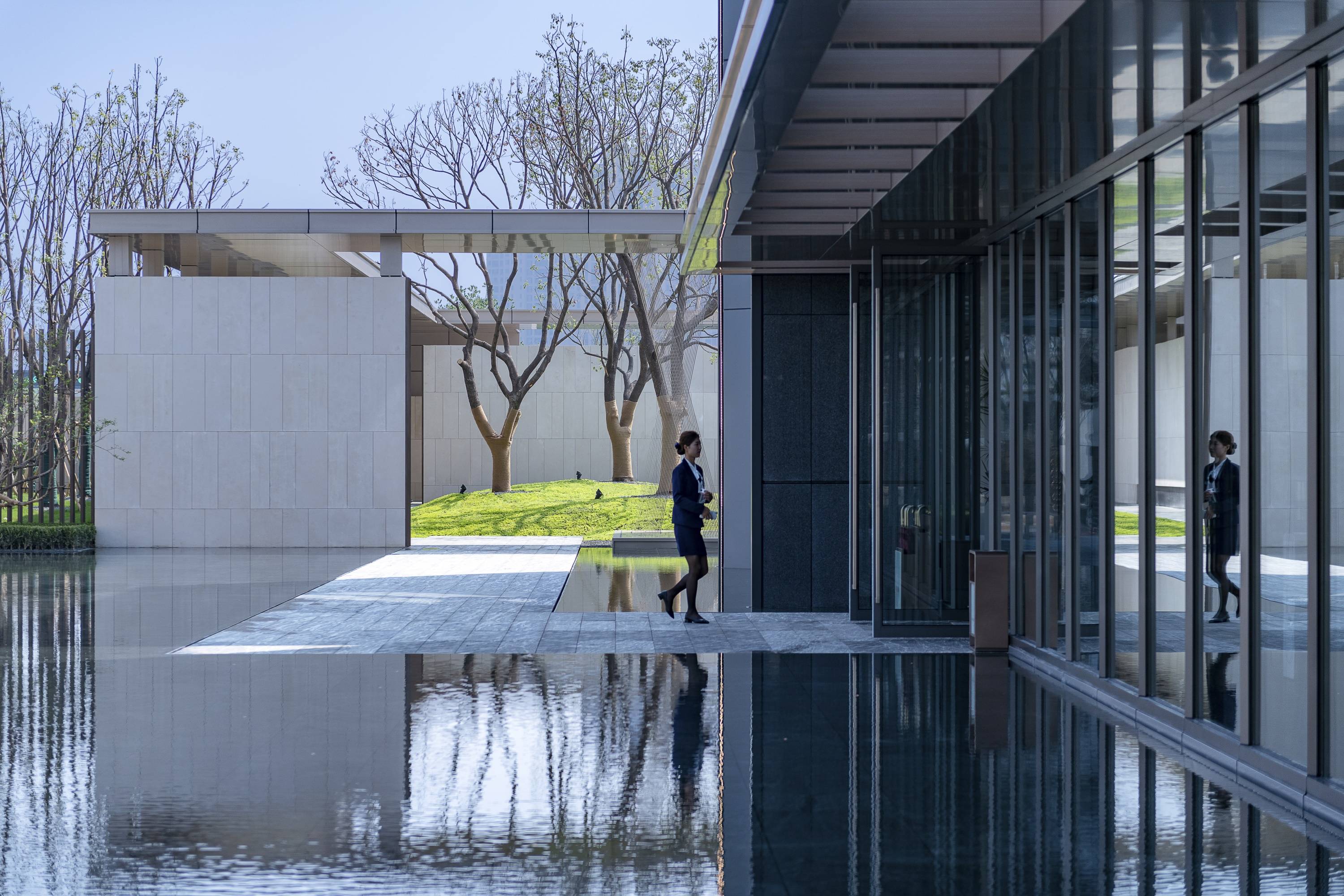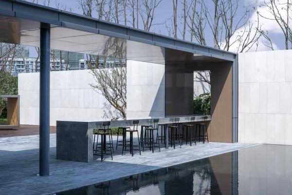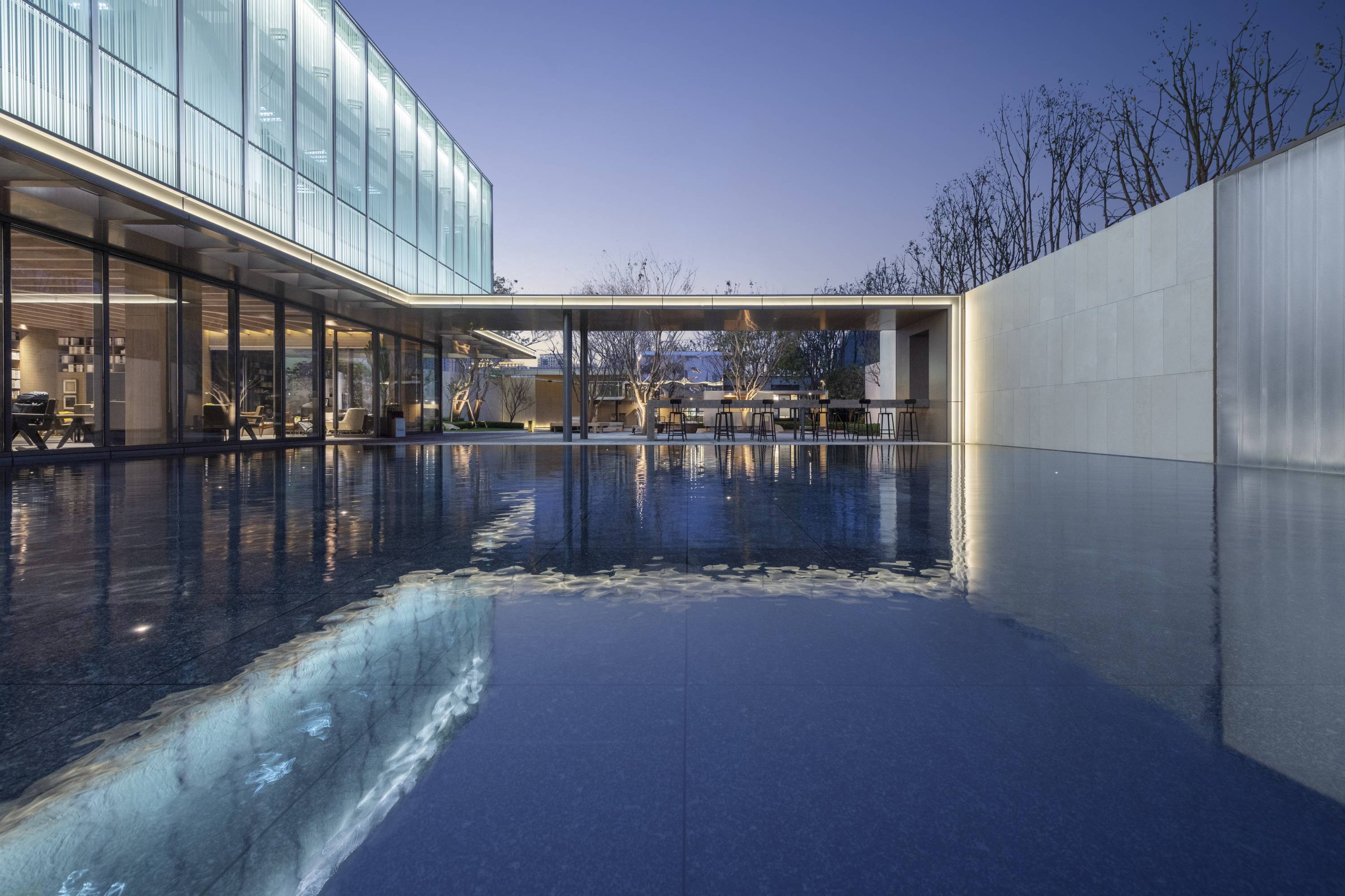臨水的洽談休閑區(qū),水榭亭臺(tái),在光的悅動(dòng)下相見(jiàn)美好。傾身而坐,都市的喧囂迅速隱去,豁然舒暢。