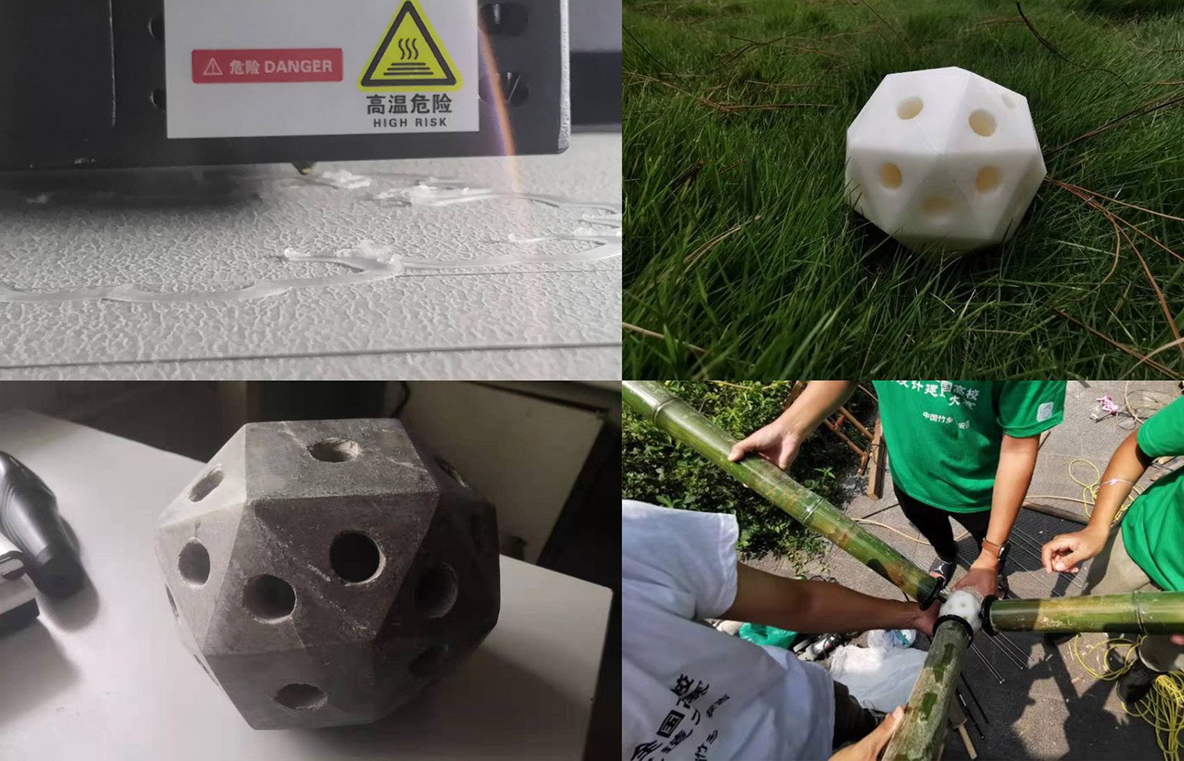 在節(jié)點確定后,開始制作實體1/1模型進行強度試驗,期間,我們嘗試使用3D打印技術(shù)制作出1/1節(jié)點,發(fā)現(xiàn)50%密度的pla材料制作的節(jié)點強度足以支撐框架的重量,且端點處的固定也極為方便,可節(jié)省大量施工時間。但由于建造地點浙江在冬天的溫度會達到零下十度左右,這使得pla材料的剛性變差,容易碎裂,因此我們有嘗試了大花崗巖制作節(jié)點,但由于重量原因未能應(yīng)用。在經(jīng)過討論后,大家一致決定將節(jié)點模型帶到現(xiàn)場,作為空間“量角器”使用,將竹子固定到金屬端頭,再將二者插到節(jié)點中,確定好節(jié)點角度后固定節(jié)點,再將節(jié)點拿下去焊接端頭。