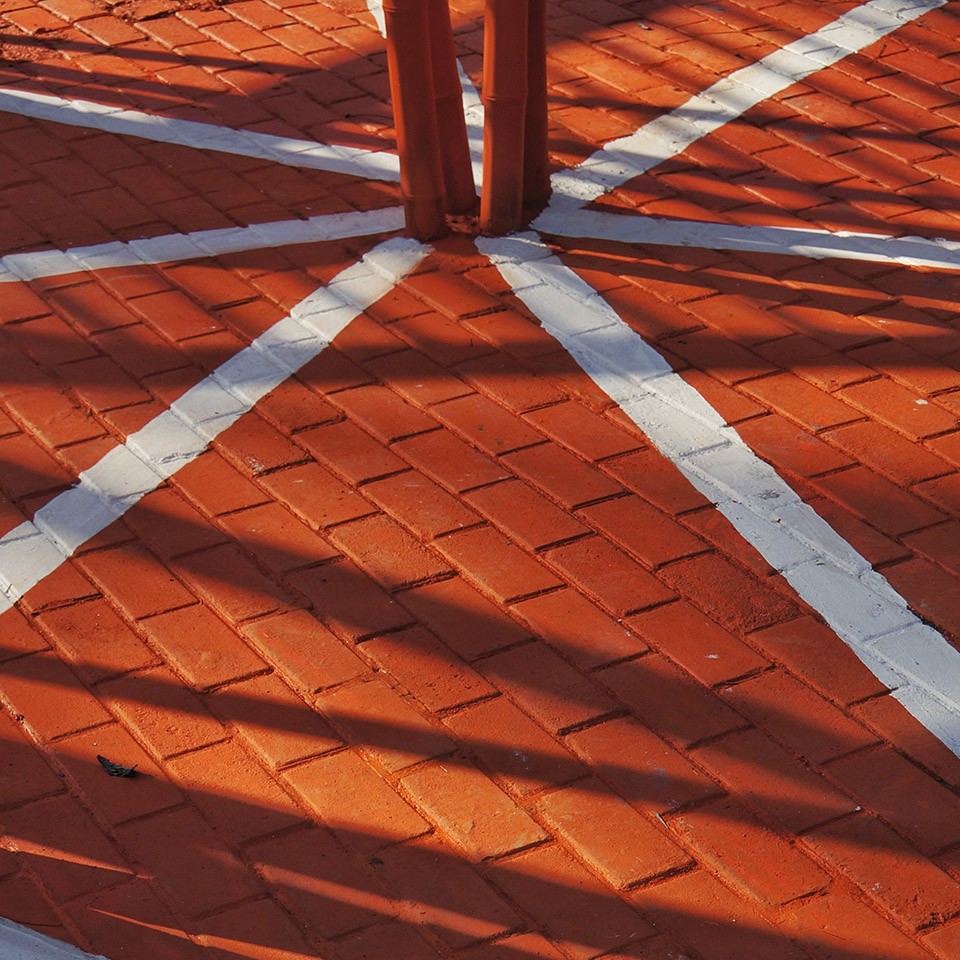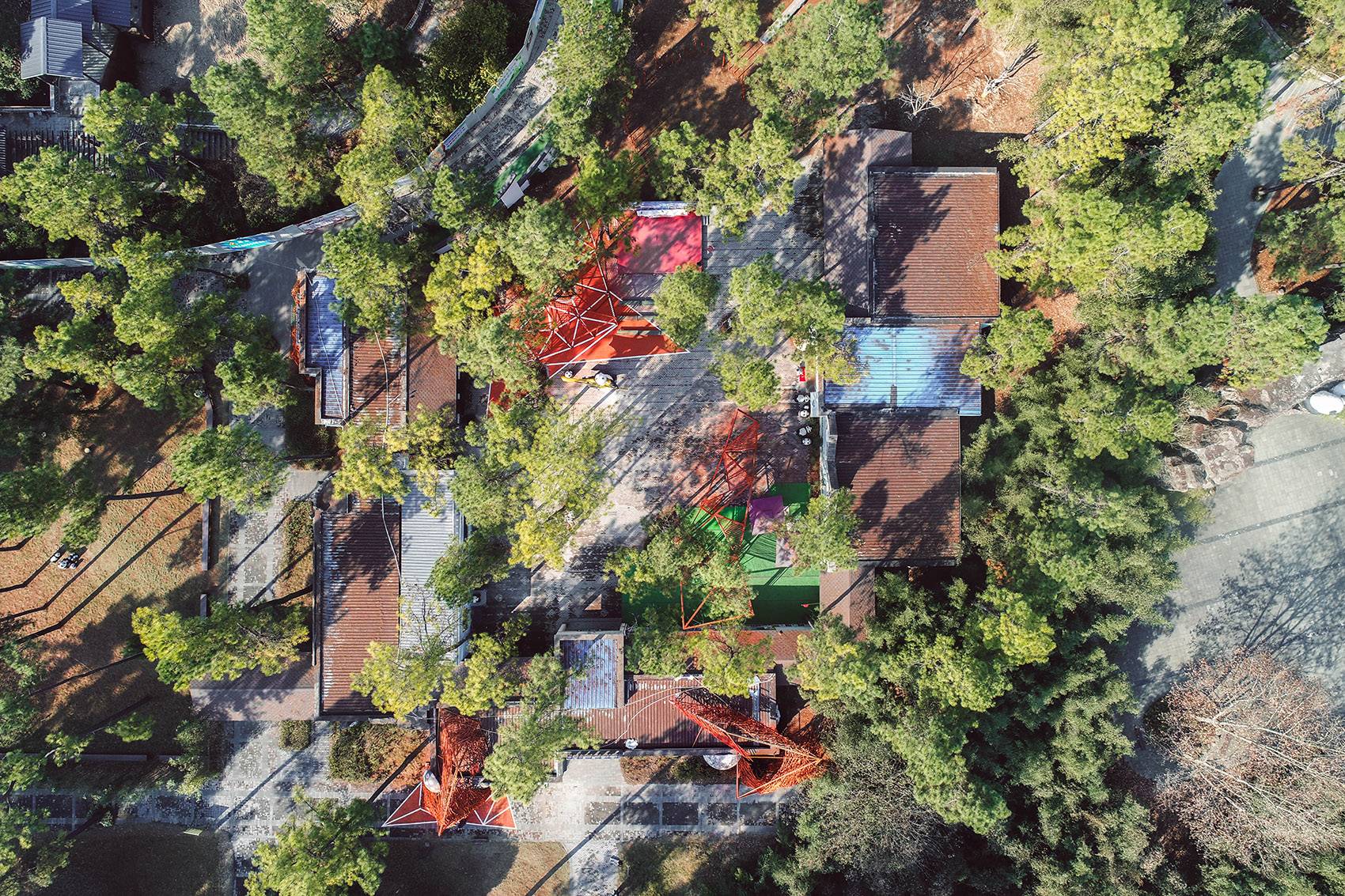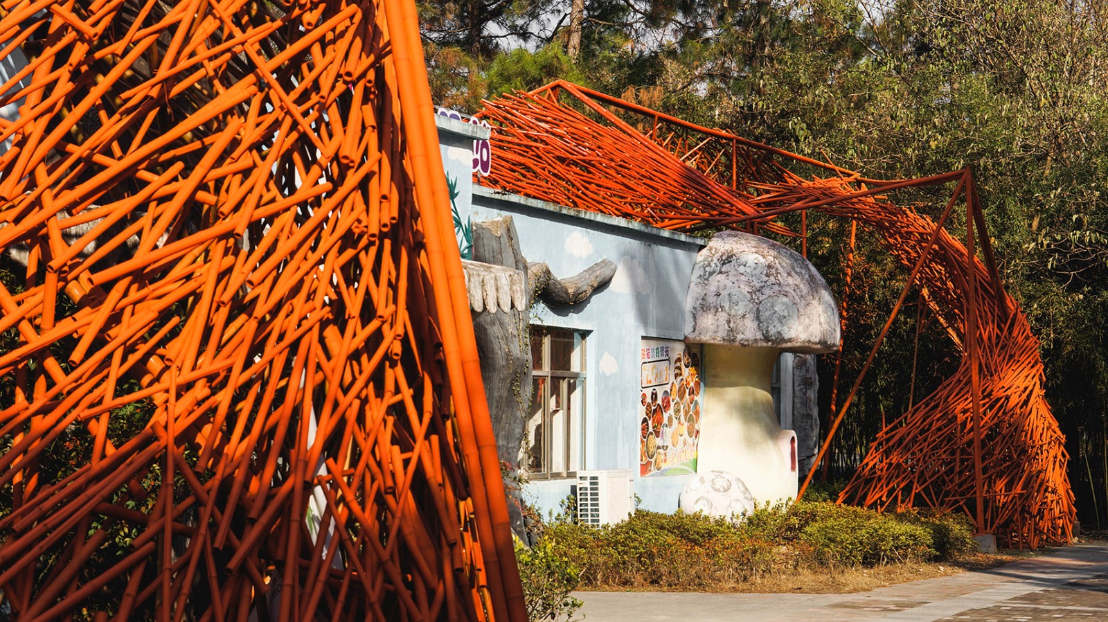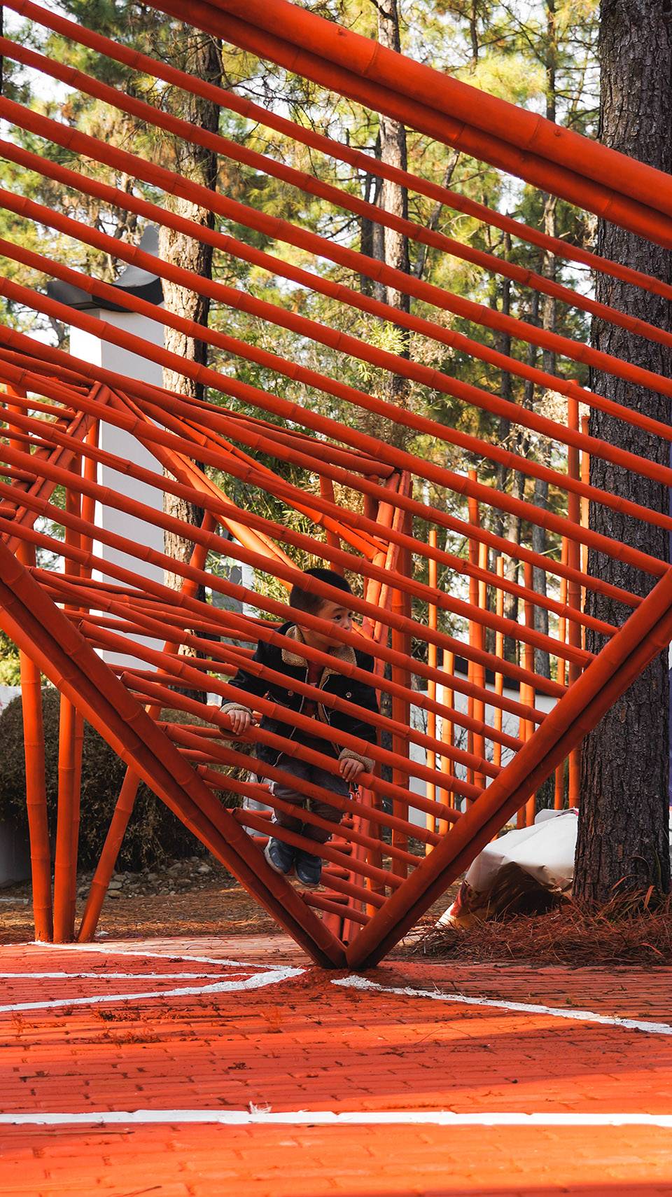 項目所選筑材為青竹,青竹的材質(zhì)十分自然,但也使得其很容易被環(huán)境隱藏,尤其在人視點上觀看,背景環(huán)境完全將搭建淹沒。因此我們希望選取一種顏色為項目進一步提升活力,使其在客觀視角獨立顯現(xiàn)出來。為此我們做了一系列色彩實驗,最終決定使用這種十分鮮活與醒目的橙紅色,為項目整體提升活力。
