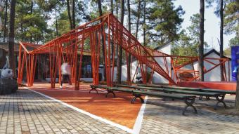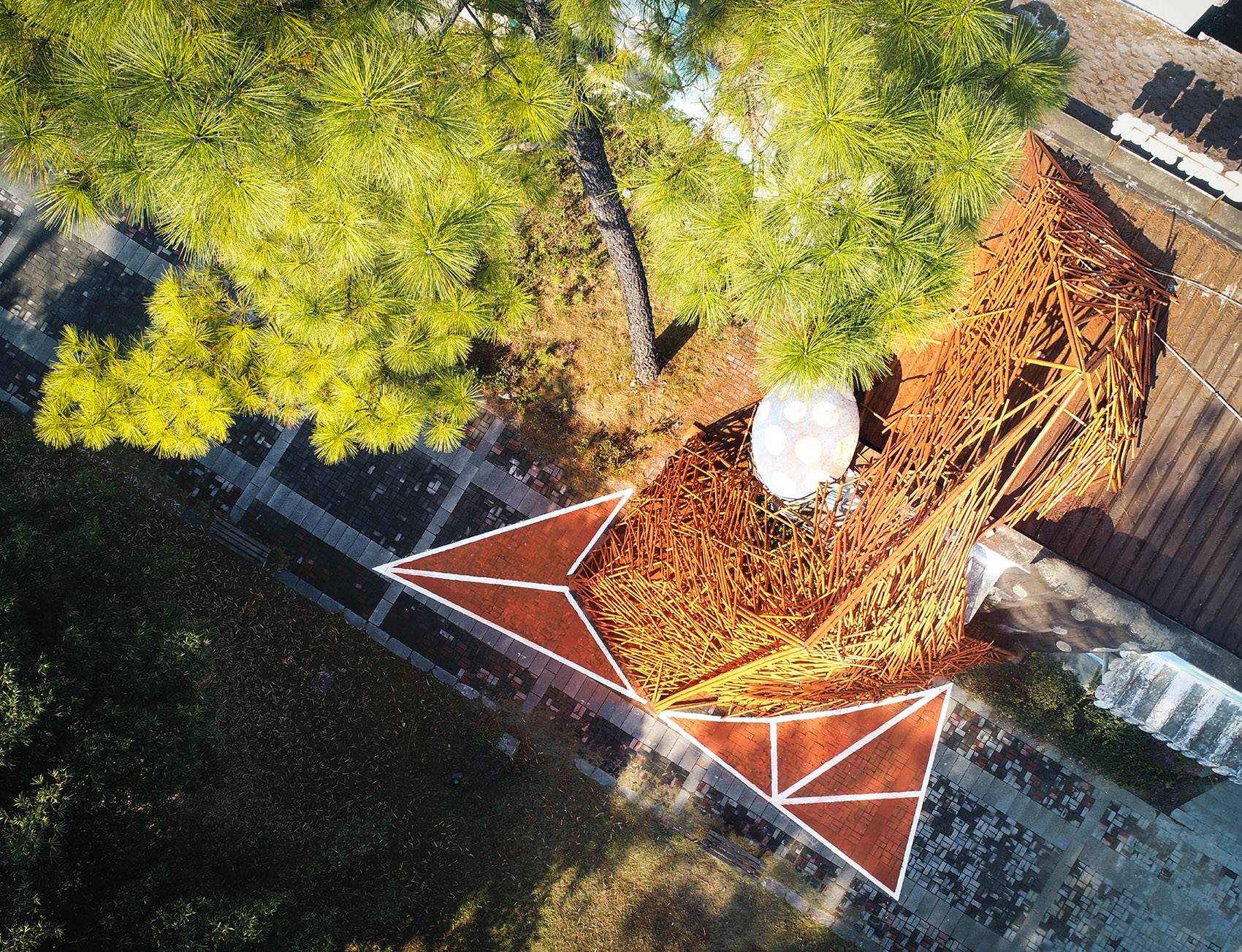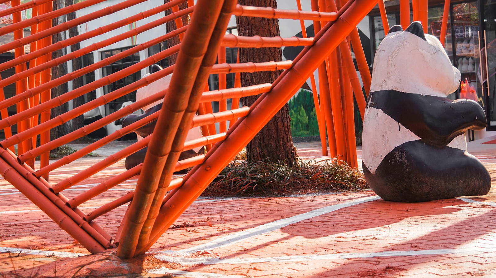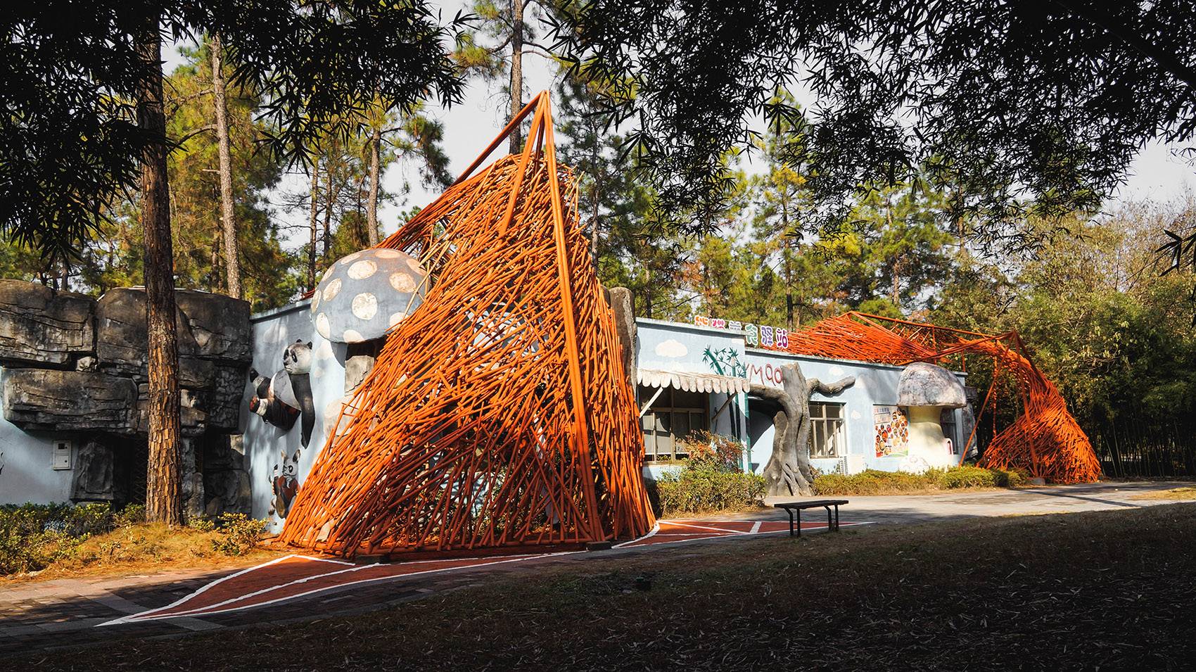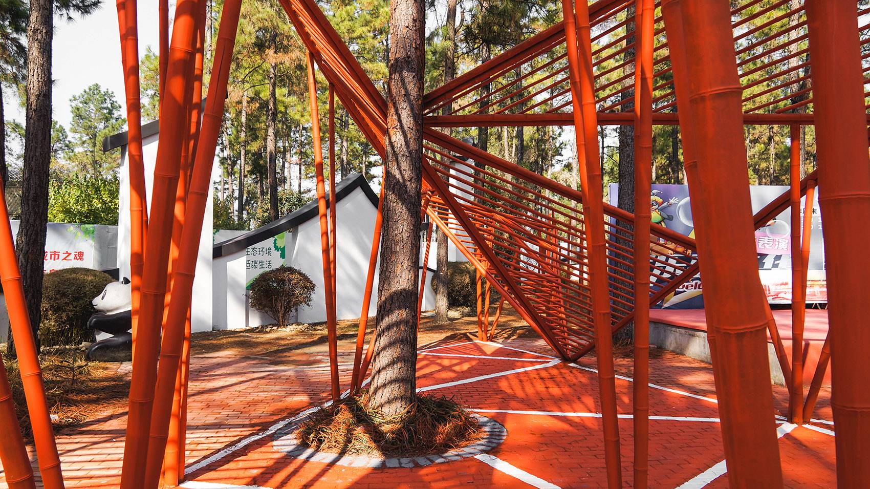 不同的生長部分在場地中變成了不同的功能,有兒童的游樂玩具,有舞臺背景,有照相打卡點,在這場由竹子組成的盛宴中,不同的功能相互交匯,共同演繹著不一樣的熊貓舞臺?;仡櫦毠?jié)紀念品商店門上第一處搭建部分成為吸引游客的裝點門面,引發(fā)游人好奇心,吸引游人觀賞;場地內(nèi)的兩部分面積較大,成為怡人的遮陰涼棚;涼棚周圍,有三角形元素座椅散及四周,供游人休息交談,引發(fā)x游人之間的交流……