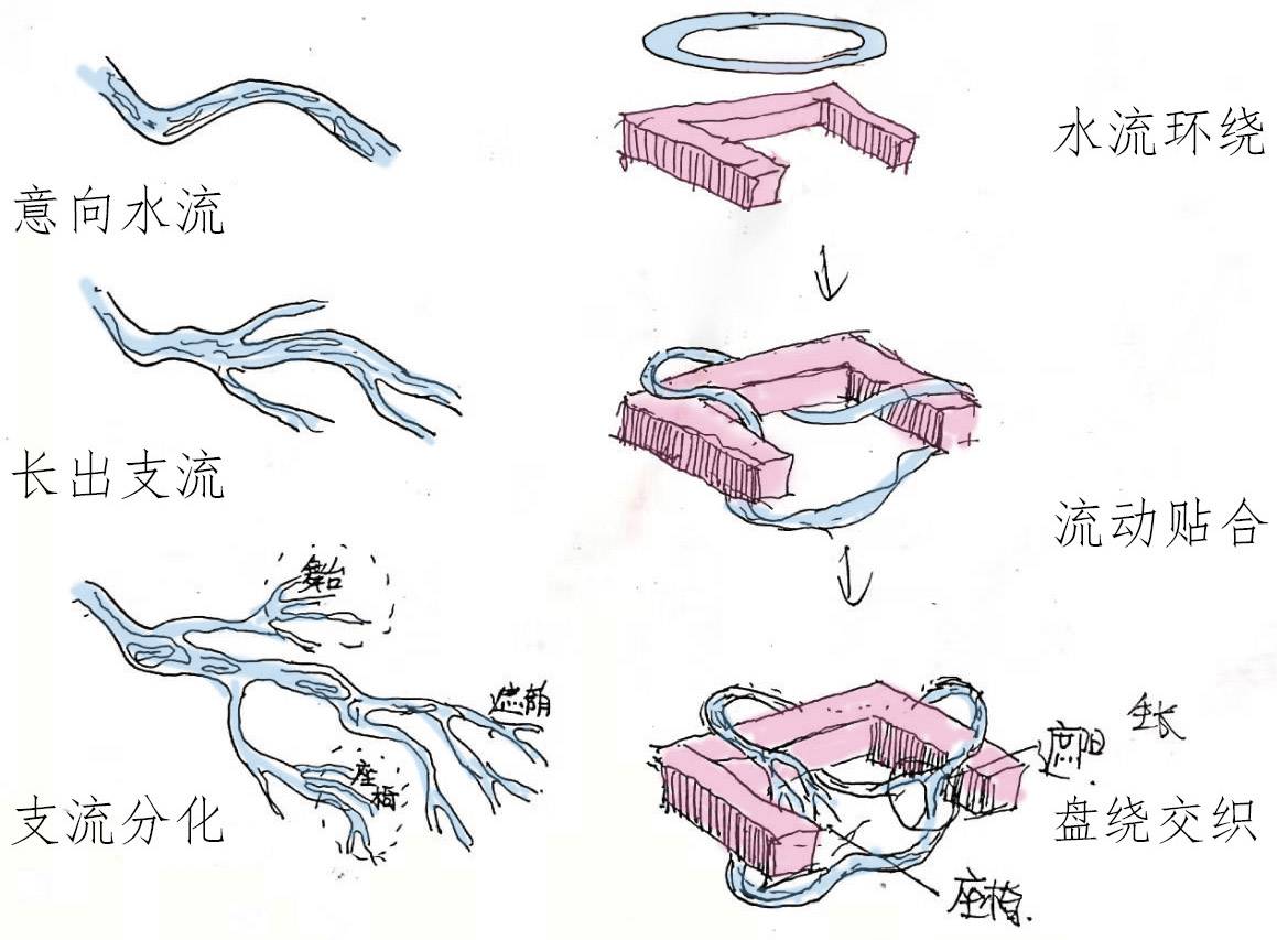 對竹材進行了仔細觀察后,你會發(fā)現(xiàn)無論如何彎曲它,它都以小段的豎直竹節(jié)組成,那么這就給予我們一個思考的切入點,以幾何形態(tài)為基礎(chǔ)來進行一種動態(tài)的自然模擬。我們以“生長”為概念,搭建被擬物化為生長中的植物一般纏繞于建筑與場地之間,它依附于建筑向上攀爬,橫向伸展,斷續(xù)有致,其中植物的枝干引導(dǎo)趨勢,控制走向,枝葉向外擴展,組織形態(tài)。他又仿佛是一股水流般懸浮在場地之上,然后貼合建筑及場地進行流動,使竹與建筑相互纏繞,成為密不可分的一體。