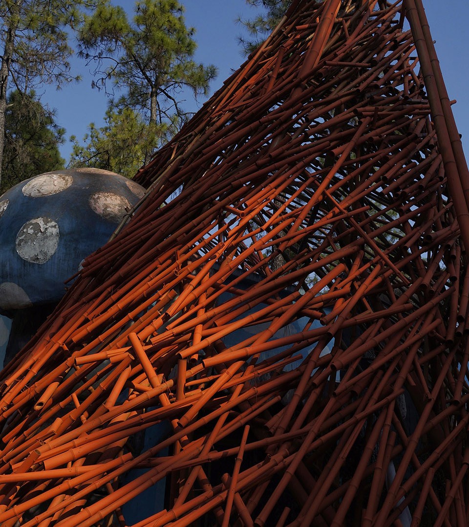 竹,取材后可制作加工為柔韌的曲線形態(tài),也常被人們利用到拱形結(jié)構(gòu)上,充分發(fā)揮其柔韌性,這可能是我們想到竹材后第一反應(yīng)的竹材的功能特性。拋開前人使用竹材的方式影響,回到竹子的生長過程并觀察其狀態(tài)后發(fā)現(xiàn),竹子的自然狀態(tài)是非常感人的。中國自古就有“寧可食無肉,不可居無竹”文人氣節(jié),從環(huán)境建構(gòu)的角度思考,竹子的生長狀態(tài)有著非常強烈的文化意象,叢生的竹、搖曳的竹葉這些片段意向,這一種景致,在一定程度上是可以象征著傳統(tǒng)東方的。從自然屬性去挖掘,你可以發(fā)現(xiàn)竹材與建構(gòu)可以在多個層面中尋找到共同的切合點,生態(tài)型竹建筑、竹構(gòu)筑物在宏觀的城市發(fā)展、國家發(fā)展甚至人類發(fā)展中都可以起到十分重要的意義和作用。所以,竹的這份自然屬性是我們非常珍視竹的。我們將我們的設(shè)計命名為生長中的熊貓舞臺,試圖從一些空間的角度,結(jié)構(gòu)的角度去表達竹的這份屬性。