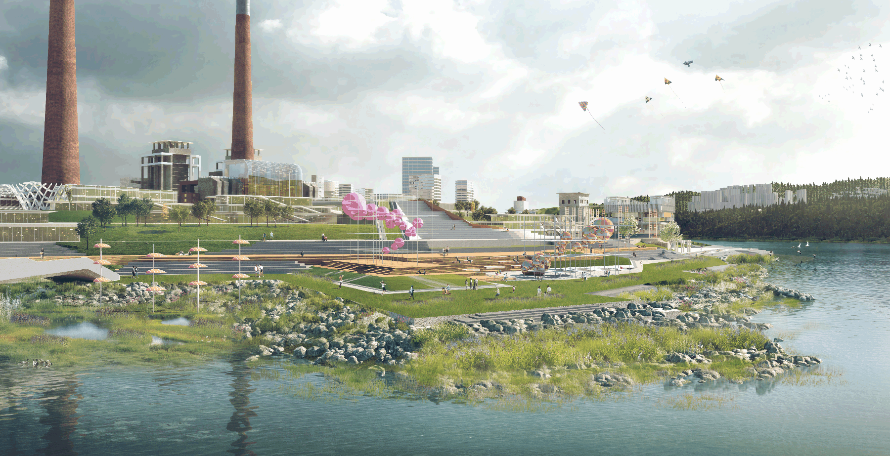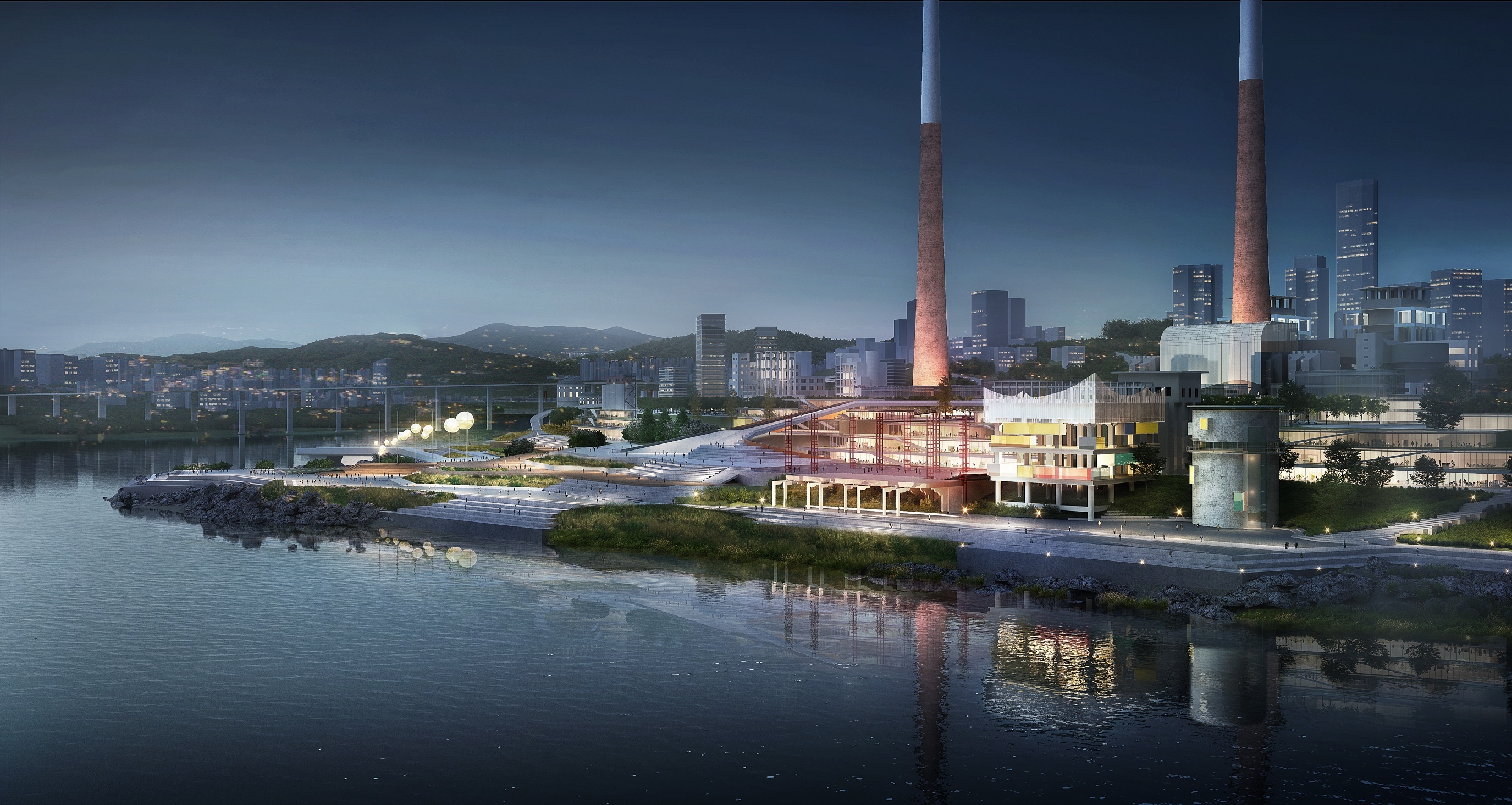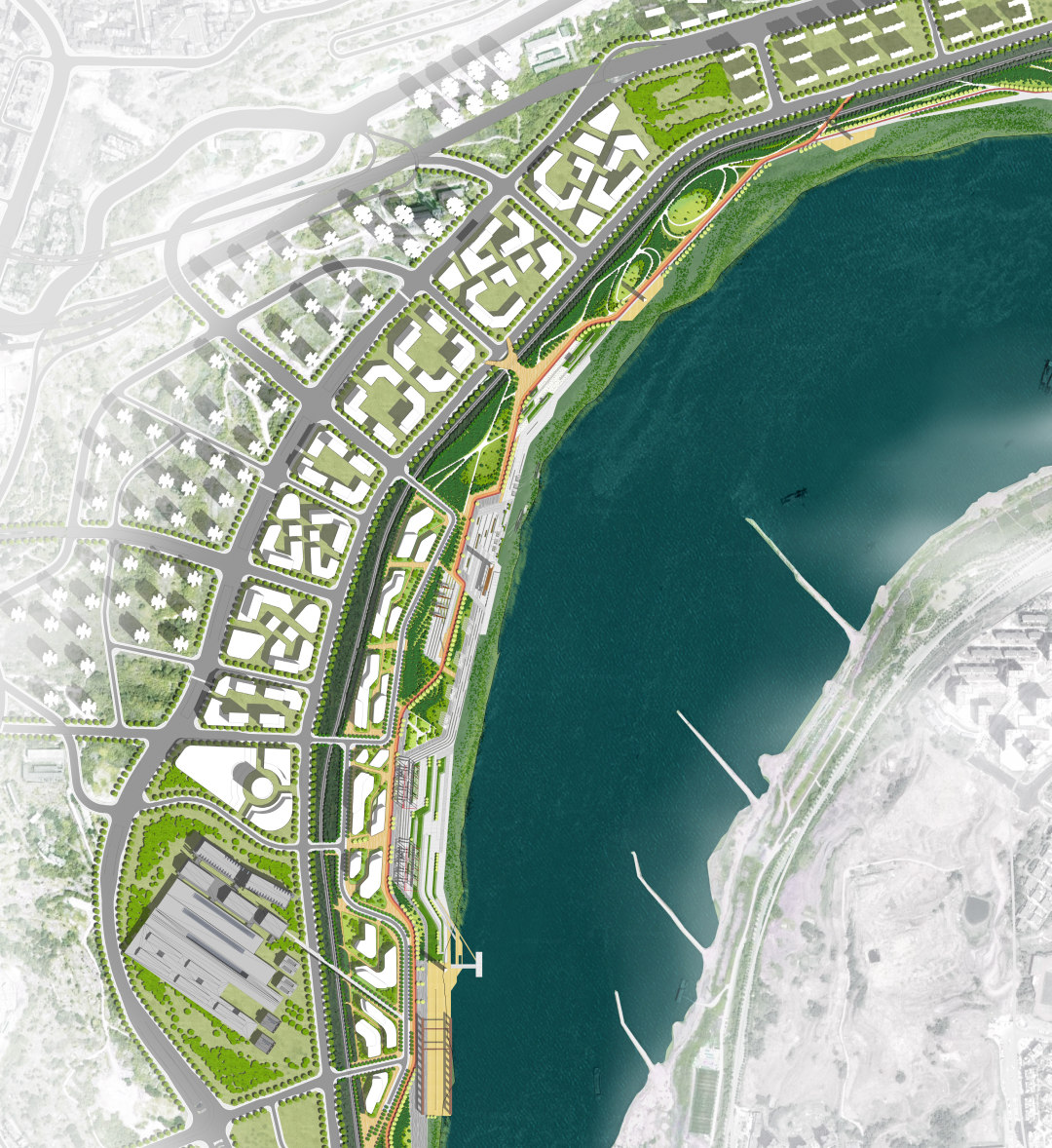 火電廠周邊將整合為藝術(shù)主題產(chǎn)業(yè)集群,利用公共交通聯(lián)動(dòng)周邊,以川美為核心,保留原來的山城肌理及部分建筑及構(gòu)架,實(shí)現(xiàn)街區(qū)有機(jī)更新;濱水空間以平臺(tái)的形式向水面層層打開,并在靠近城市一側(cè)打造多樣活動(dòng)平臺(tái),延續(xù)重慶川美精神,打造具有人氣與活力的城市休閑空間。
