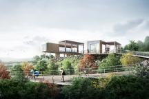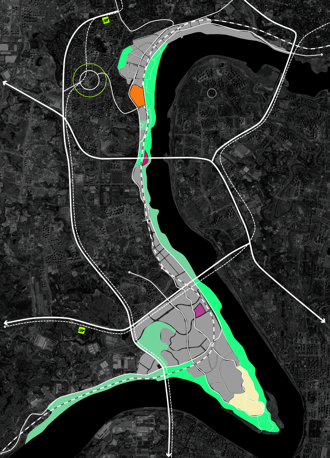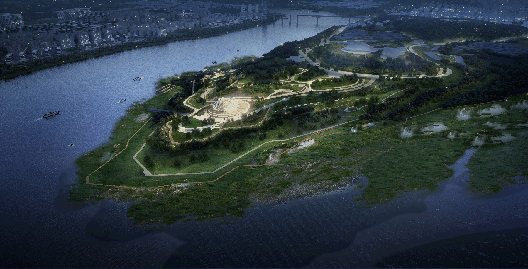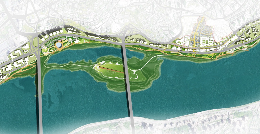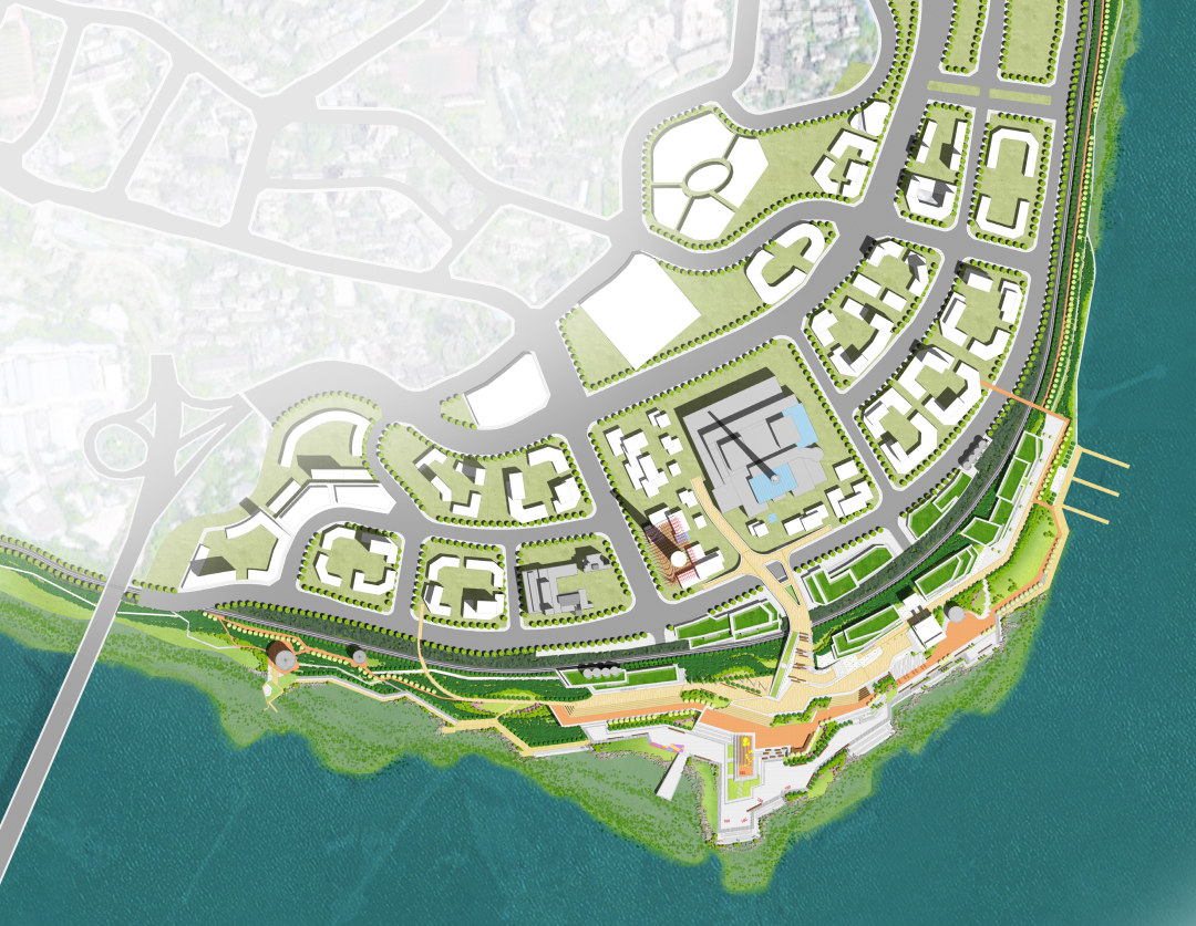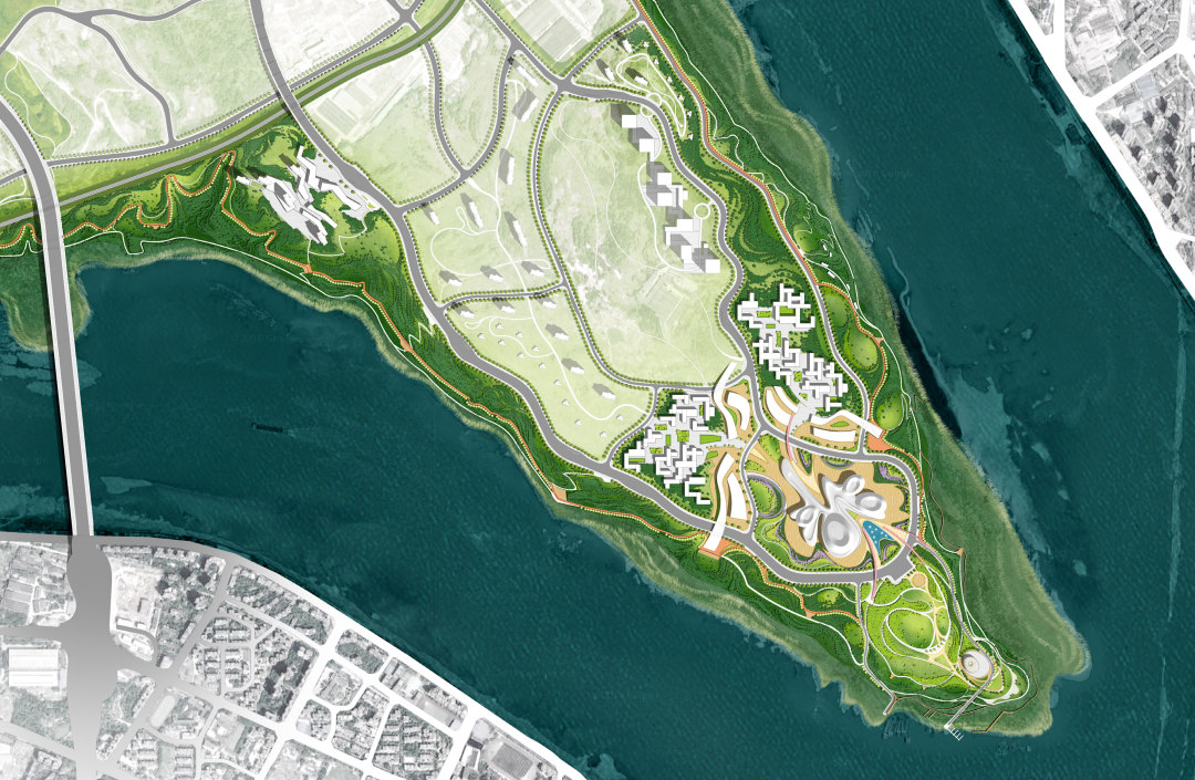 釣魚嘴半島定位于打造“區(qū)域性休閑旅游度假區(qū)”,將重點(diǎn)發(fā)展會(huì)議展覽、休閑娛樂、旅游度假、主題公園、現(xiàn)代居住等功能。方案沿承生態(tài)理念和低敏感設(shè)計(jì)手法,尊重動(dòng)物棲息空間,綠繞半島,重回生態(tài)棲息地;同時(shí)結(jié)合會(huì)展中心,以富于音樂韻律的景觀手法和有如半島明珠的溫室共同打造長(zhǎng)江綠色地標(biāo)。