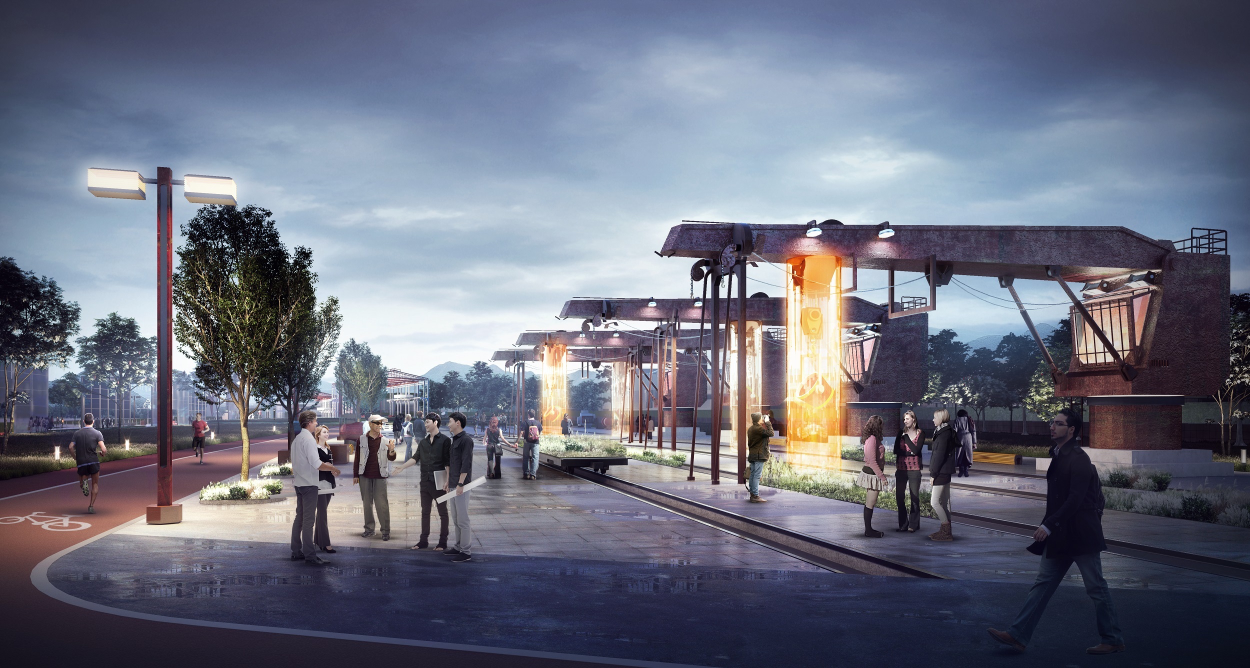 重鋼片區(qū)以博物館為核心,結(jié)合新城建設(shè),引入創(chuàng)新、高科技等業(yè)態(tài)。打造文化創(chuàng)意水岸,聯(lián)動(dòng)崖線公園成生態(tài)文化大環(huán)線;沿江打造兩條景觀走廊,以串聯(lián)四大功能板塊,并以軌道的元素和代表重鋼歷史的文化雕塑貫穿始終,表現(xiàn)“十里鋼城,重現(xiàn)輝煌”。