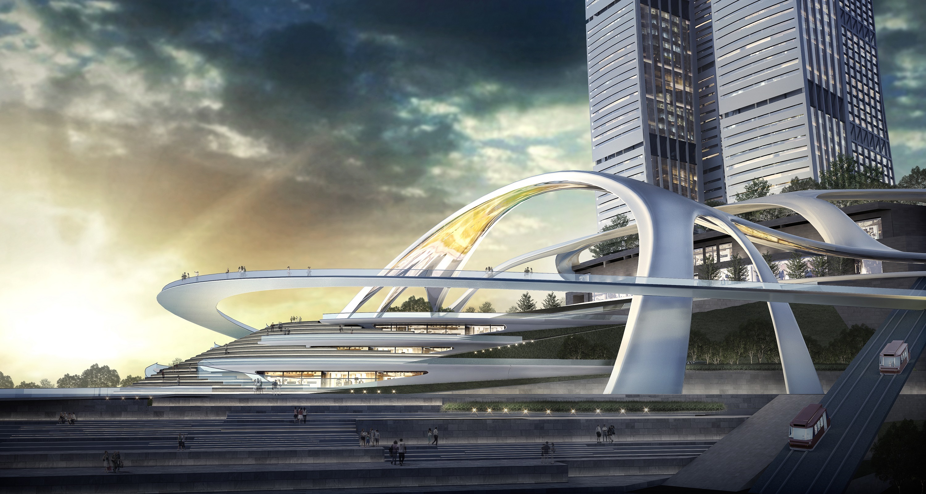 在高密度、大體量的城市環(huán)境中,邁柏希望“還城以綠”,塑造半島優(yōu)良小氣候并柔化來福士廣場(chǎng)的強(qiáng)大體量。設(shè)計(jì)將游覽空間與規(guī)劃館的展示空間結(jié)合成為一體化立體森林;架設(shè)天橋系統(tǒng)與空中花園,使游人暢游于朝天門魔幻的綠色世界;同時(shí)強(qiáng)化“梯坎”與“門”的意向,延展朝天門從古至今的精神意涵和城市記憶。兩江聚源,重回地標(biāo)。