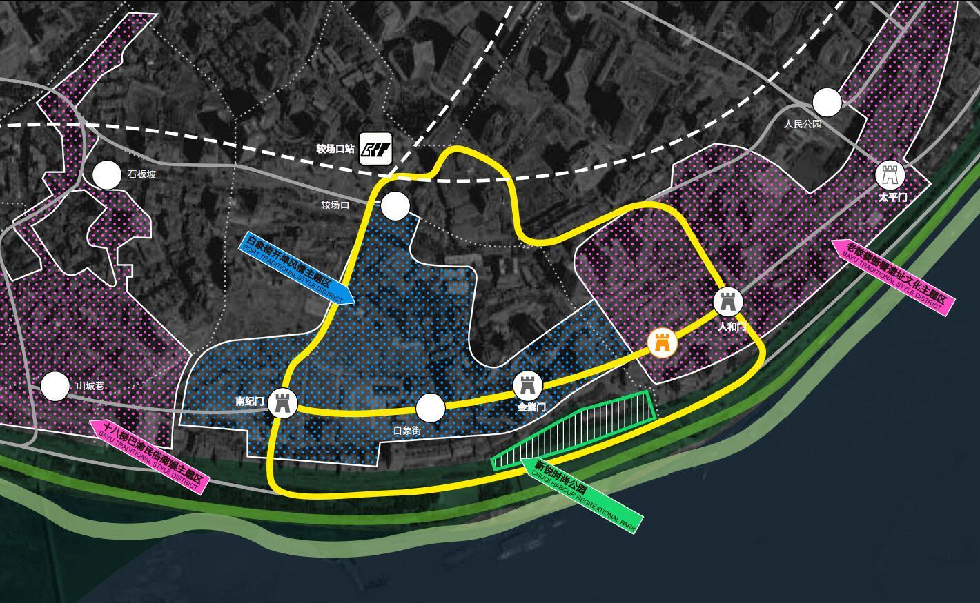 自朝天門開始的長(zhǎng)江北岸,是重慶母城文化、巴渝文化等悠久歷史形態(tài)的核心載體,也是串聯(lián)周邊文化景點(diǎn)的重要水岸。此外,重慶的“城門文化”也為這座城市留下了深深的烙印,敘述歷史。