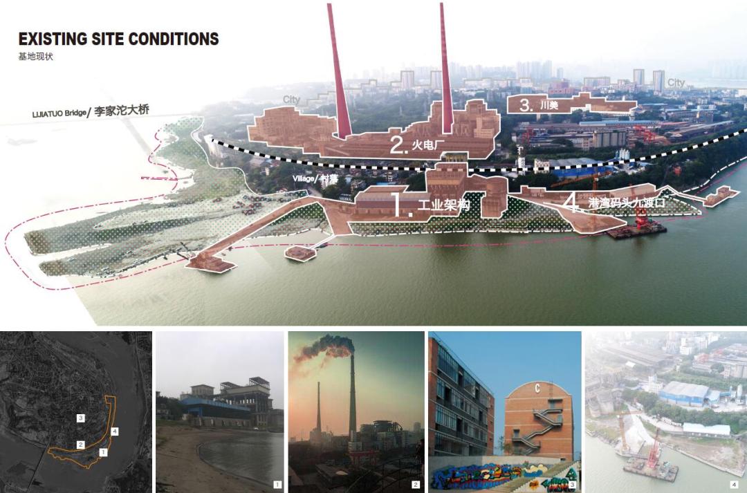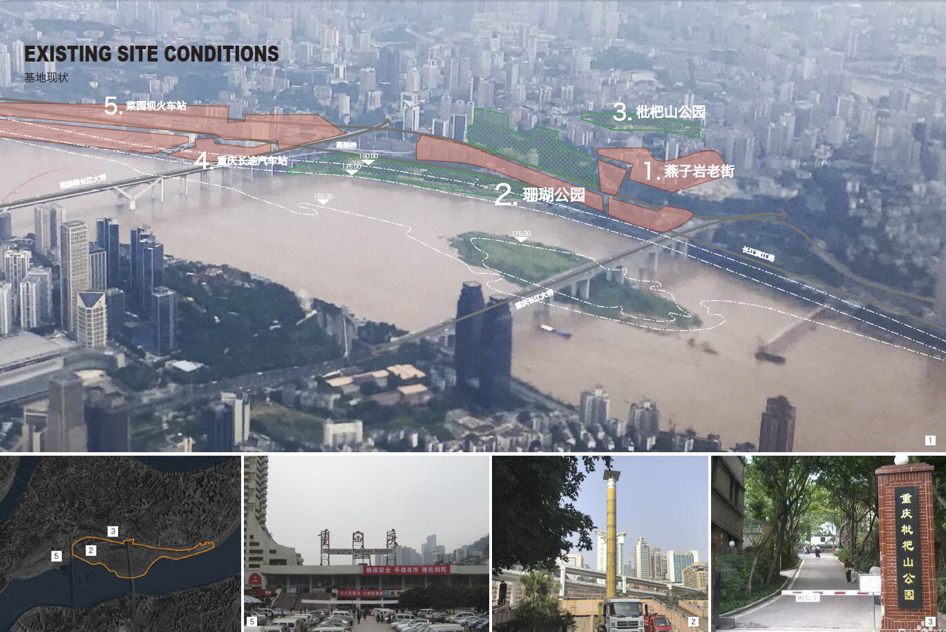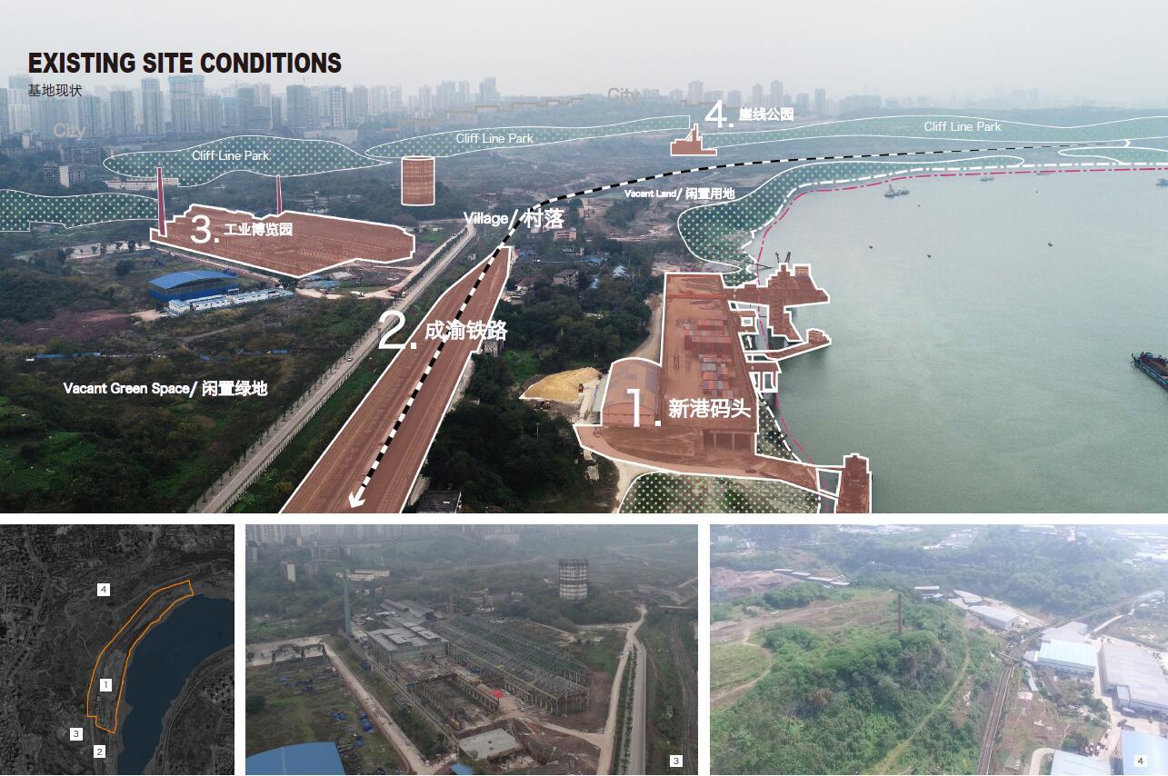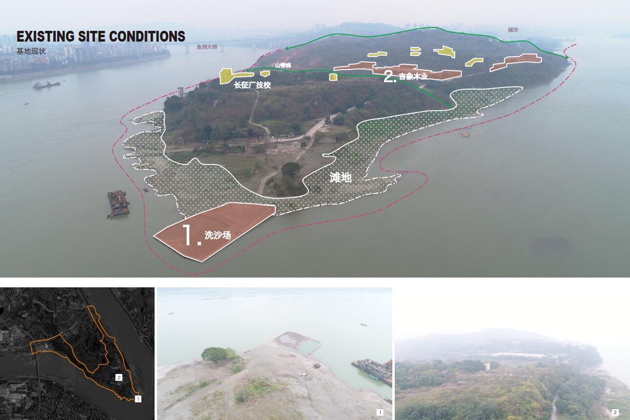 1965年,重慶市人民政府為服務(wù)重鋼,設(shè)立大渡口區(qū)。灘地南側(cè)現(xiàn)狀部分為挖沙場(chǎng),水土流失嚴(yán)重;北側(cè)為野生綠化,生境基礎(chǔ)良好但景觀性較差;西側(cè)重鋼工業(yè)搬遷后為工業(yè)棕地;而釣魚嘴半島是重慶主城區(qū)內(nèi)開發(fā)最晚的一個(gè)半島,整體仍處于待開發(fā)狀態(tài)。