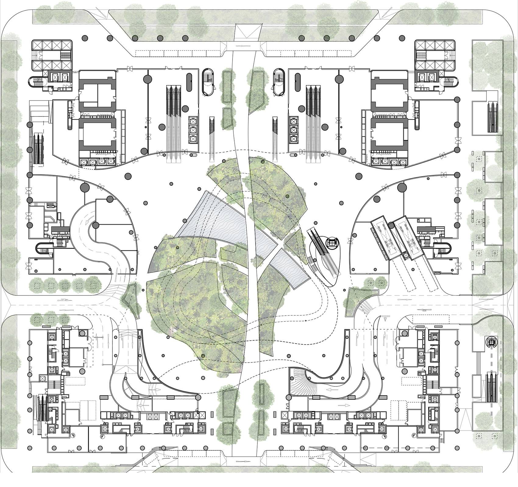 今天,全世界有超過(guò)50%的人居住在城市中,在接下來(lái)的30年內(nèi),這一數(shù)字將增至70%。到2050年,世界人口數(shù)量將增長(zhǎng)到90億-100億。這意味著在人口密集的都市區(qū)域需要建造足夠多的高層建筑才能夠適應(yīng)人口的變化。包含四座高層建筑的濱海盛景,其設(shè)計(jì)的核心在于塑造一個(gè)共享式的中央空間,也就是“綠色之心”?!熬G色之心”由 ingenhoven建筑事務(wù)所與景觀設(shè)計(jì)事務(wù)所Gustafson Porter + Bowman通力協(xié)作完成。作為新加坡濱海中央商務(wù)區(qū)內(nèi)最大的公共景觀區(qū)域,“綠色之心”使人們的生活更加接近自然,同時(shí)場(chǎng)地中的有效空間達(dá)到了原先的125%。