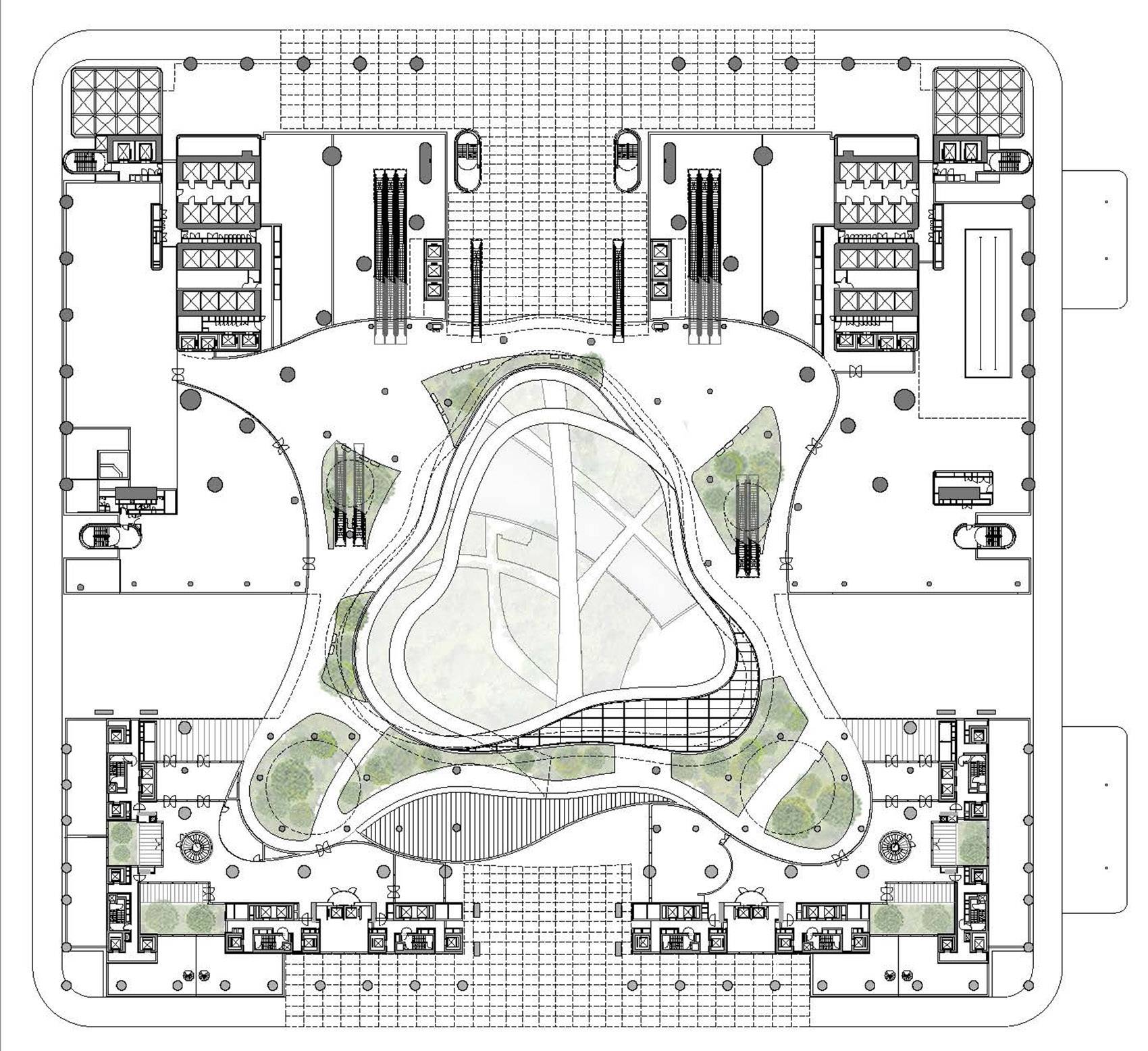 ▲“綠色之心”在綜合體的中央地帶形成一個(gè)垂直的綠洲