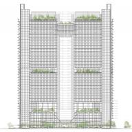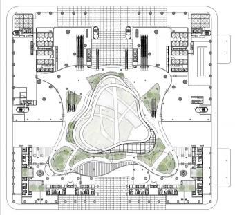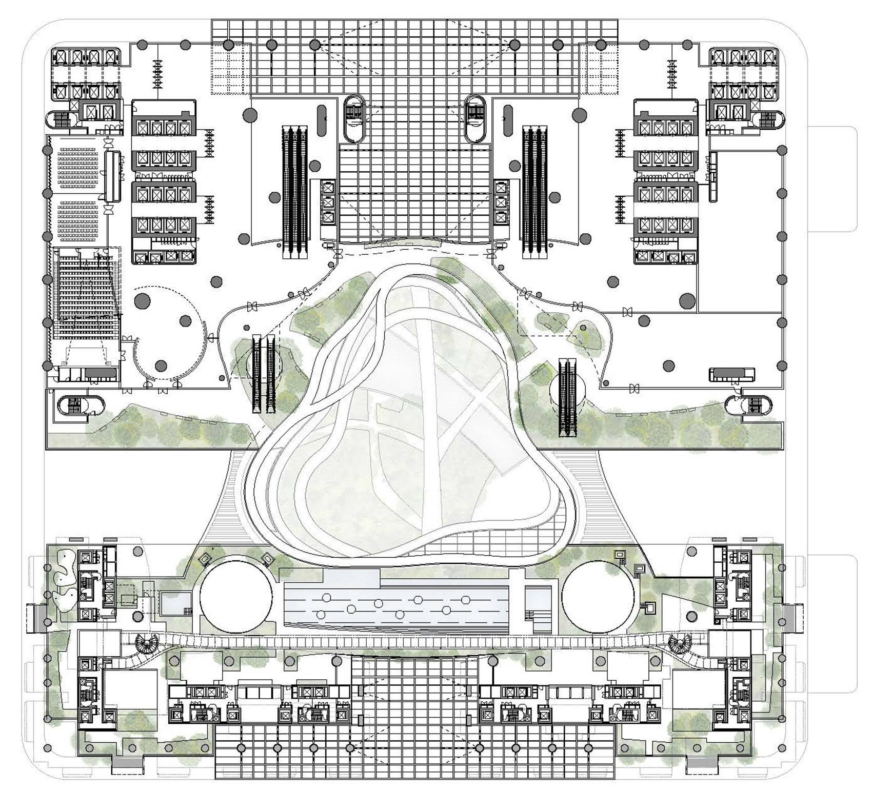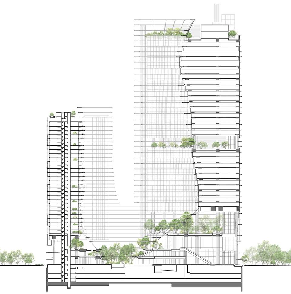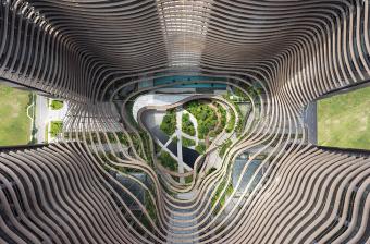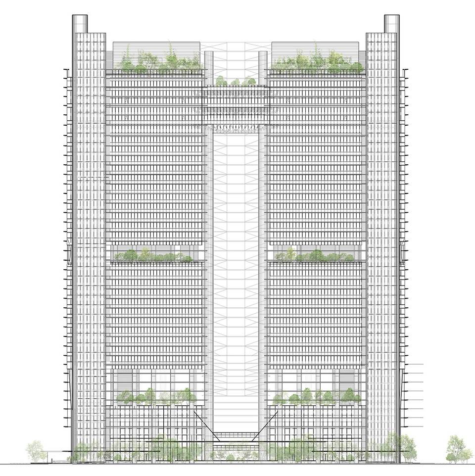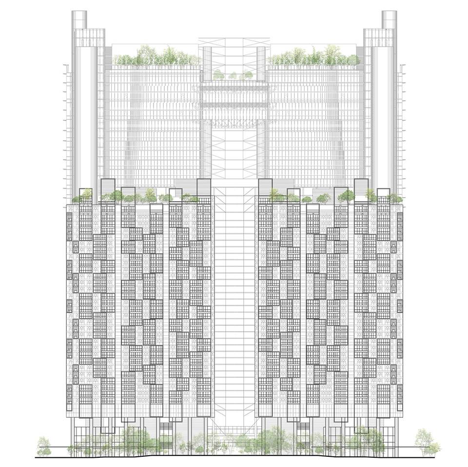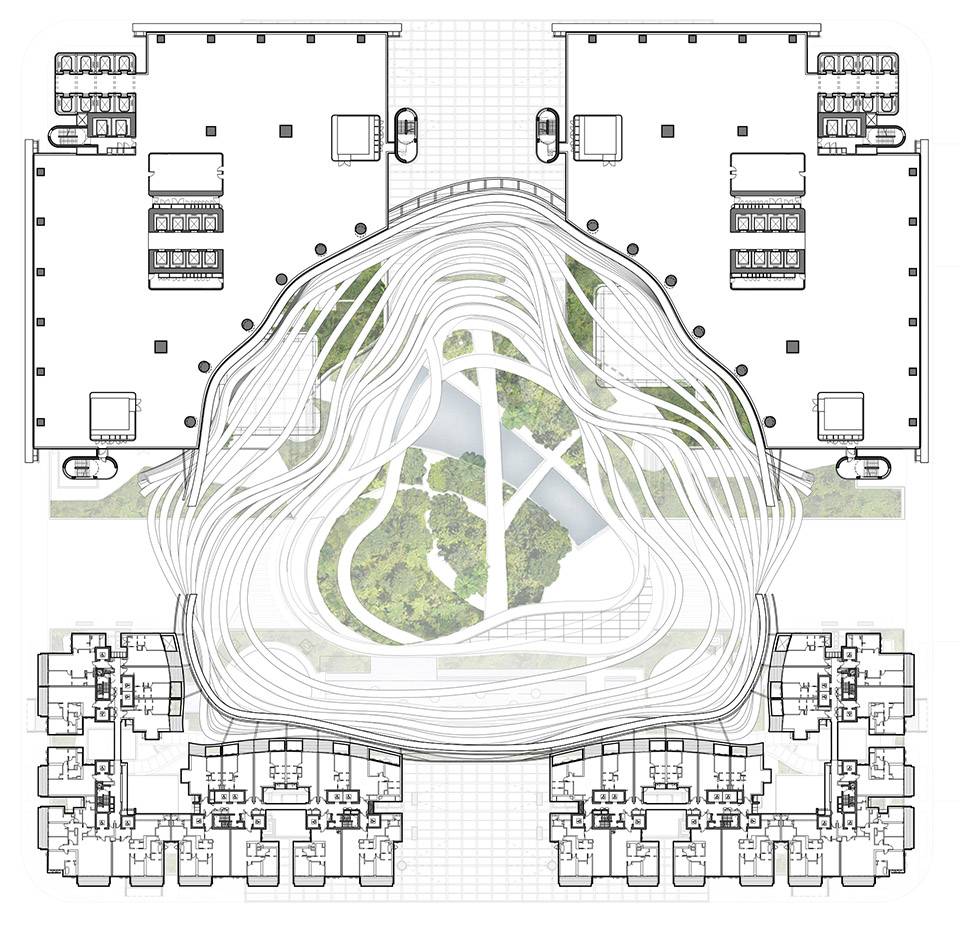 標(biāo)志性的百葉窗為綜合體帶來(lái)了動(dòng)態(tài)的外觀,大面積的綠化區(qū)在改善微氣候的同時(shí)還增加了生物多樣性。以亞洲常見(jiàn)的水稻梯田為靈感,由四棟建筑圍合起來(lái)的中央地帶呈現(xiàn)出多層次的立體效果,展現(xiàn)出熱帶風(fēng)情的多樣性,營(yíng)造出一個(gè)全新的生態(tài)?!熬G色之心”種植著超過(guò)350種不同的樹(shù)木和植物,包括700棵樹(shù),以及3萬(wàn)7千平方米的景觀區(qū)域。另外還有多種類(lèi)型的動(dòng)物在此棲居。參照熱帶雨林中自然氣候的垂直分層,景觀設(shè)計(jì)師模擬出了一個(gè)綠色的山谷,使其氣候根據(jù)層級(jí)發(fā)生變化。建筑中的餐廳、咖啡廳、健身俱樂(lè)部、游泳池、超市、美食街以及位于戶(hù)外平臺(tái)的各種活動(dòng)區(qū)域不僅僅服務(wù)于居民和辦公人員,更提供了社交與互動(dòng)的場(chǎng)所。
