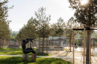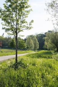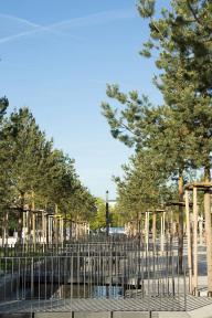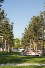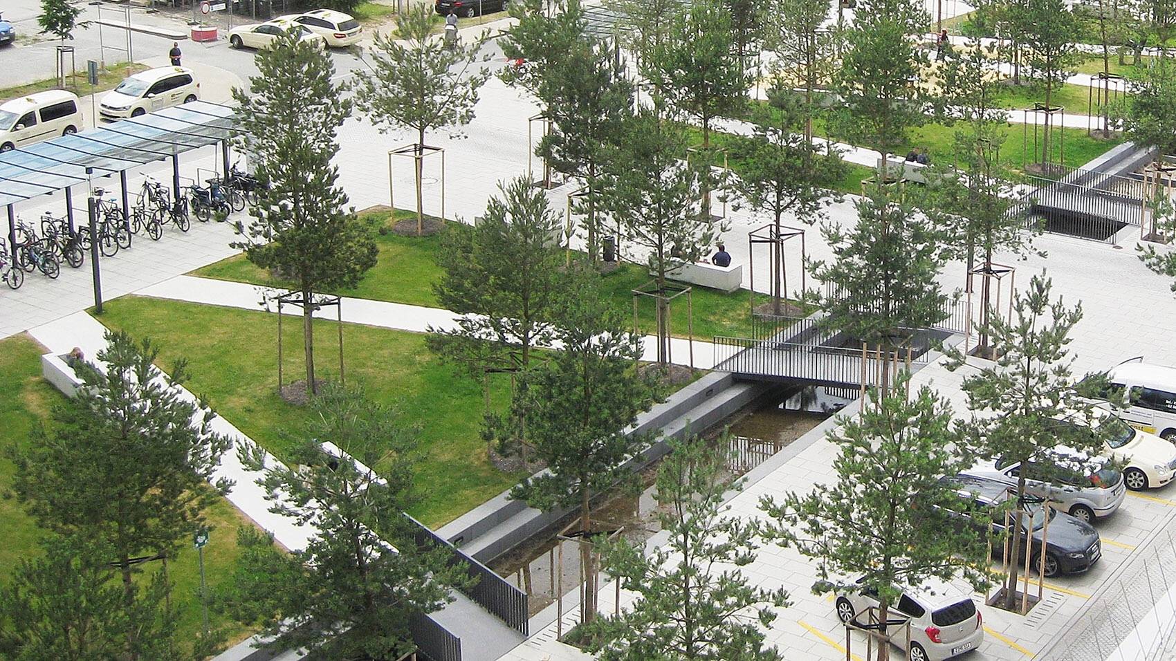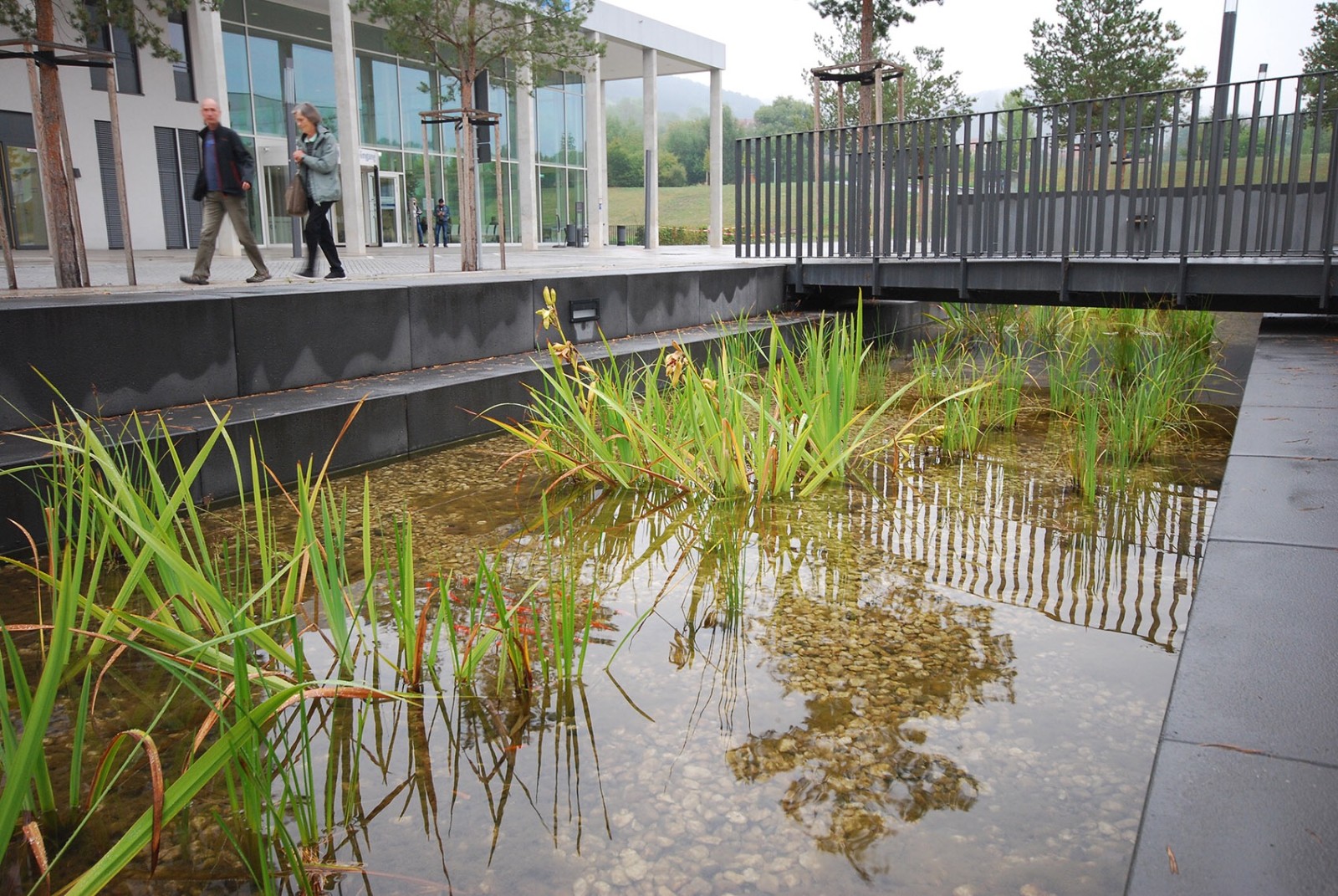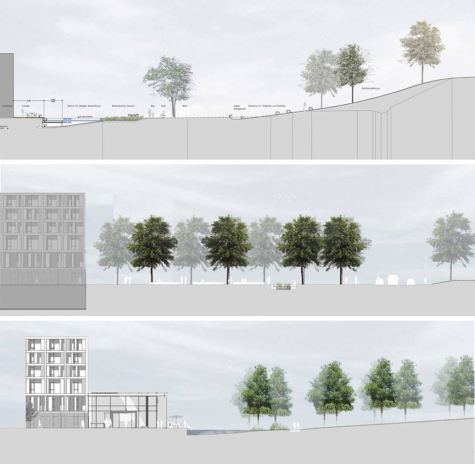 原場地的雨水利用率偏低。為解決這個(gè)問題,設(shè)計(jì)團(tuán)隊(duì)采取了兩種雨水回收和蒸發(fā)方案。場地北側(cè)的雨水蓄留池可接收花園及斜坡草地的徑流。該水池將作為雨水管理中的緩沖區(qū),留存及沉淀過濾后的雨水。干旱時(shí)期可汲取池中雨水進(jìn)行灌溉,完成雨水的循環(huán)利用。