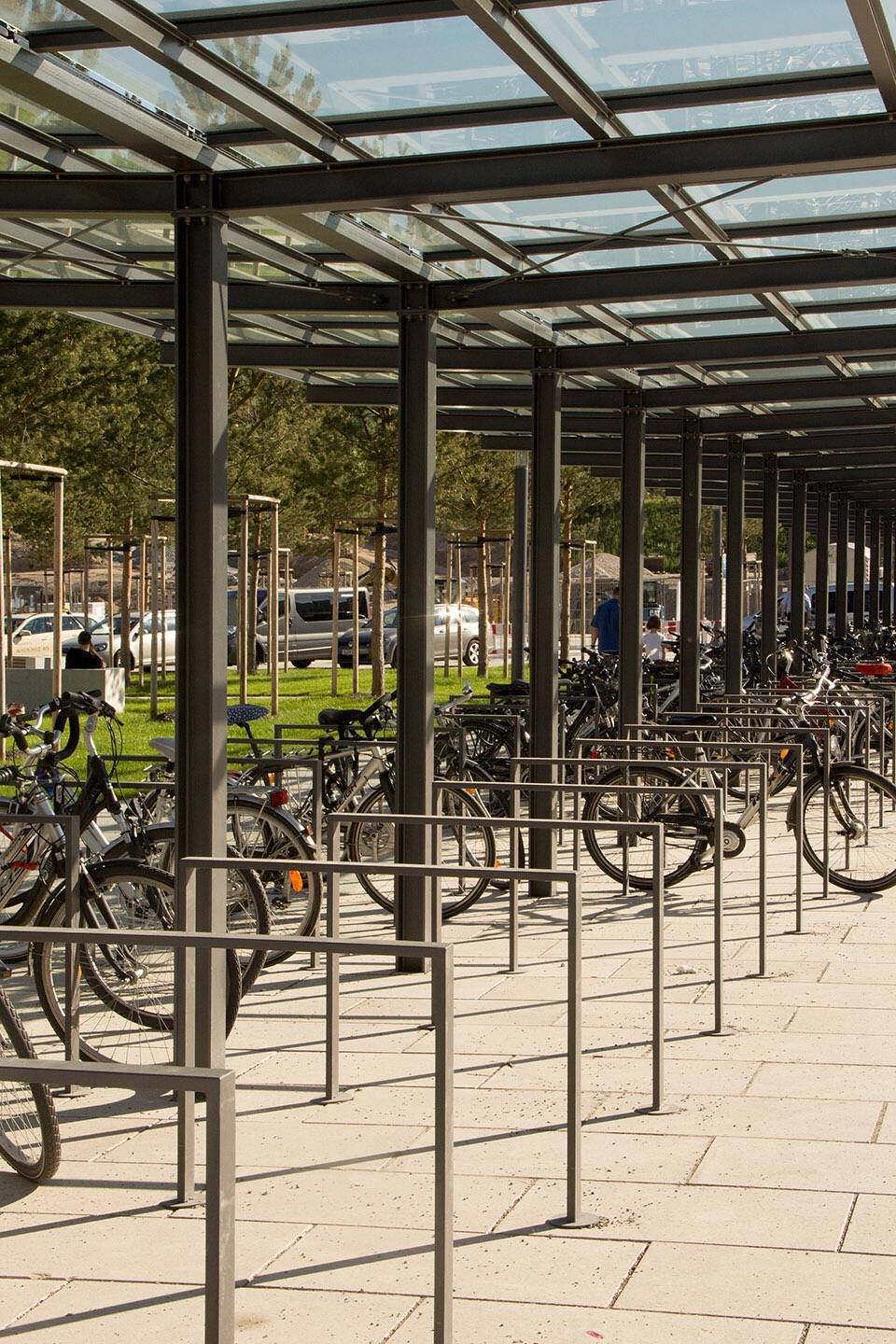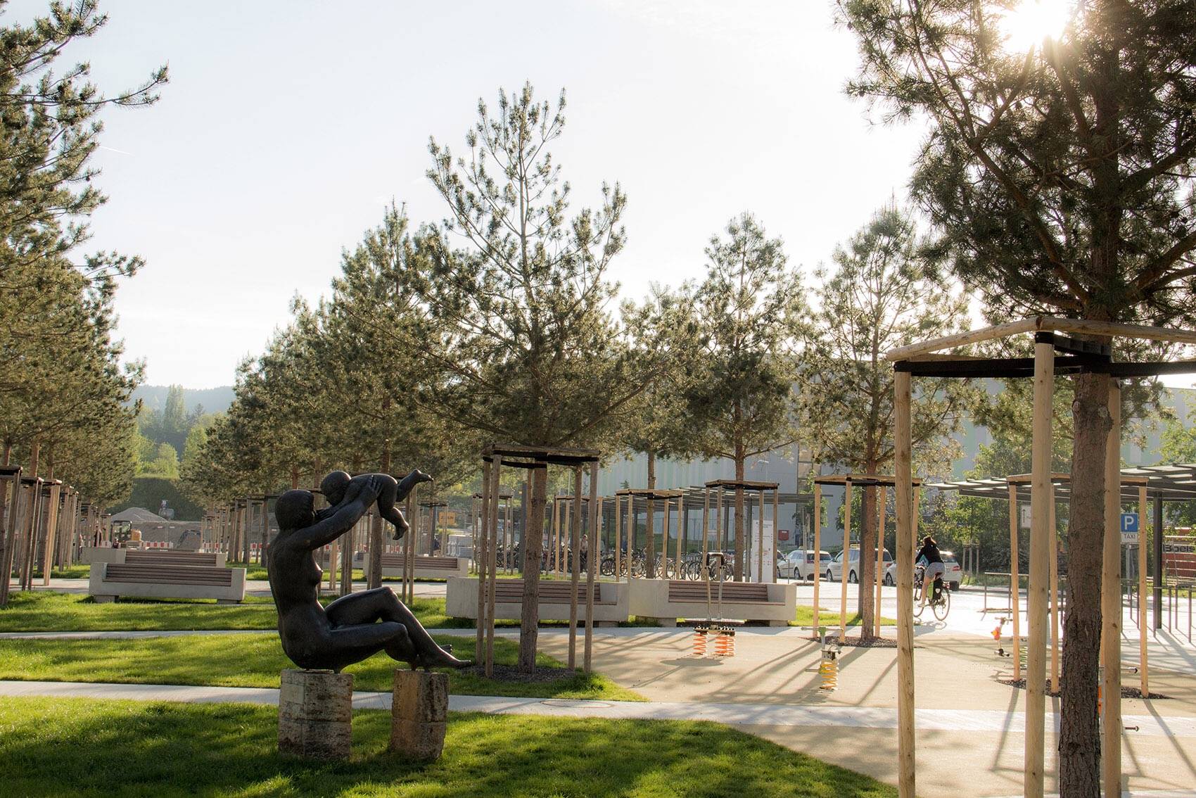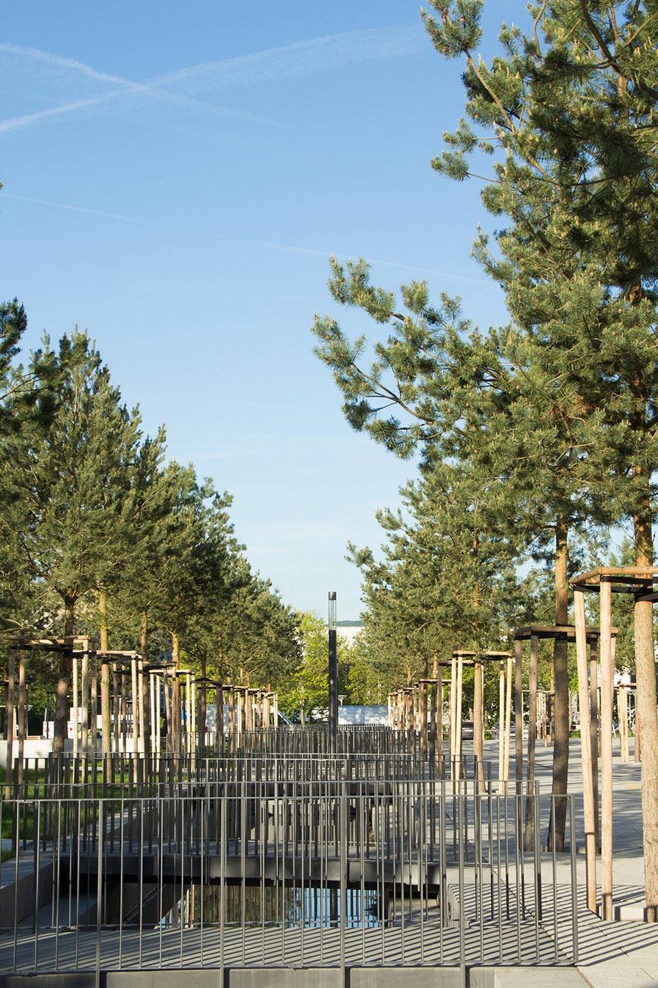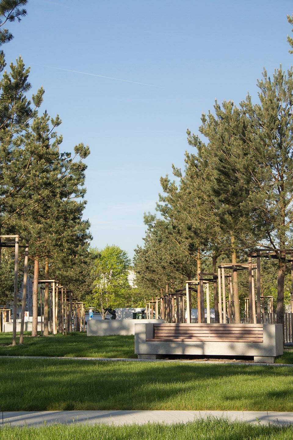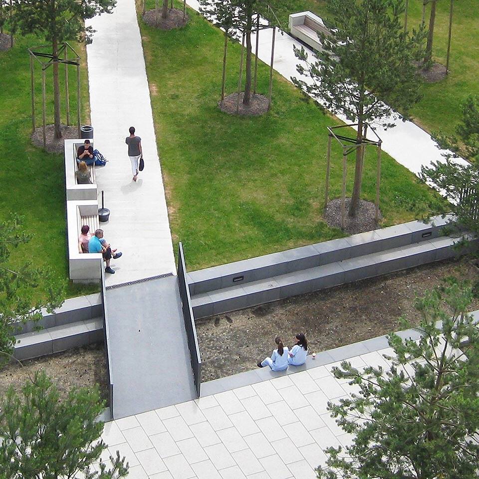 沿街綠地空間作為車輛停靠點(diǎn)與醫(yī)院主入口的過渡區(qū)域,增強(qiáng)了醫(yī)院與周邊城市空間的聯(lián)系。鑒于醫(yī)院的特殊性,無障礙化設(shè)計(jì)是該項(xiàng)目的重點(diǎn)之一。加寬的平緩人行道上額外提升了鋪裝的摩擦系數(shù),以確保輪椅使用者在雨天的通行安全。
