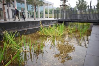屋頂綠化有效緩解了場地雨水徑流壓力。前廣場的水帶收集建筑屋頂雨水及空調(diào)冷凝水,并與花園區(qū)的雨水蓄流池相連,整合成為一個(gè)功能完整的雨水管理系統(tǒng)。