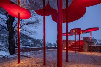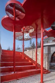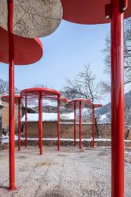 在這里,設(shè)計師還試圖“混淆”建筑與藝術(shù)裝置的邊界。室外看臺,傘狀構(gòu)筑物被紅色覆蓋,形成了強烈的,不同于常規(guī)建筑學(xué)的視覺語言。它更趨近于藝術(shù)性的表達(dá),單純、強烈,甚至略顯極端;同時,紅色給予了空間一種新的氣場:更開放的公共性,戲劇性、敘事性和張力都比建筑語言更簡單,更具力量。