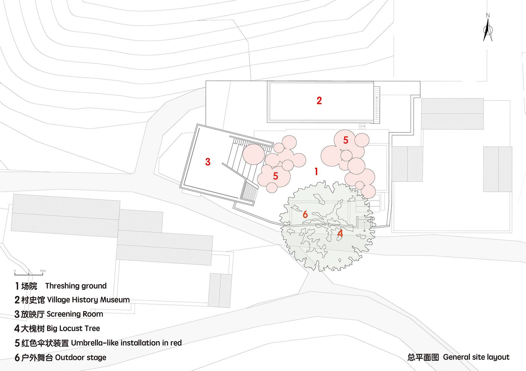 昔日村民聚集在大槐樹下,互通有無,互相交流的場景給了設(shè)計師靈感。這是一個半開放的公共空間:大樹的樹冠限定了場所的“邊界”,樹冠、陰影和人的活動構(gòu)成了場所的氣質(zhì)和場所中的事件。這是一種公共空間的原型。