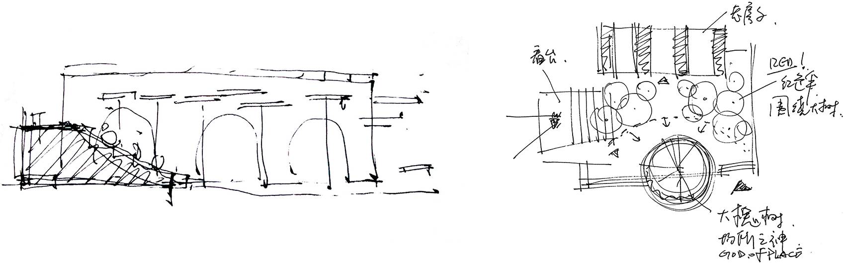 正如韓洪溝老村的現(xiàn)狀一樣,大槐樹也已經(jīng)物是人非,昔日的熙熙攘攘早已不復(fù)存在。如何重新建構(gòu)鄉(xiāng)村公共空間,從而重新塑造場所精神(genius loci)是本次設(shè)計的重點。此外,設(shè)計師也不希望只是簡單的重復(fù)歷史,畢竟韓洪溝老村已經(jīng)有了新的產(chǎn)業(yè)定位,即:基于地域建筑風(fēng)貌和紅色歷史傳承的鄉(xiāng)村旅游。新的鄉(xiāng)民,新的產(chǎn)業(yè)定位,需要大槐樹和樹下空間扮演新的角色。