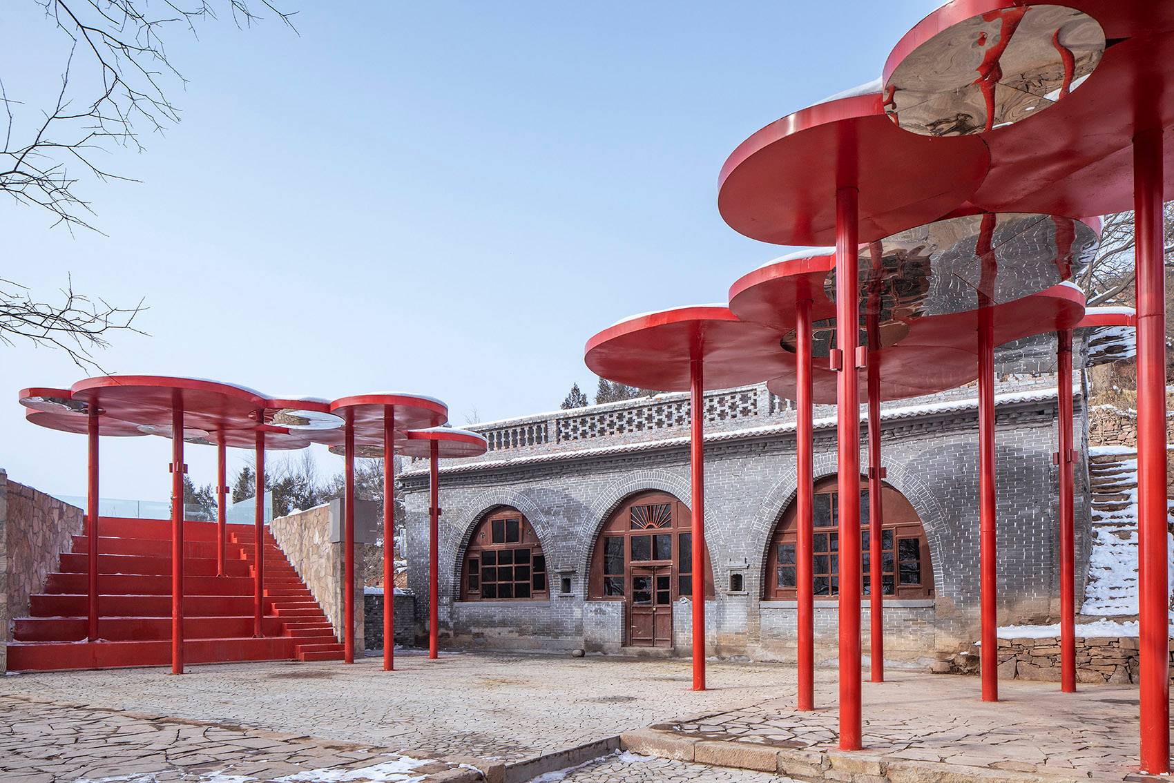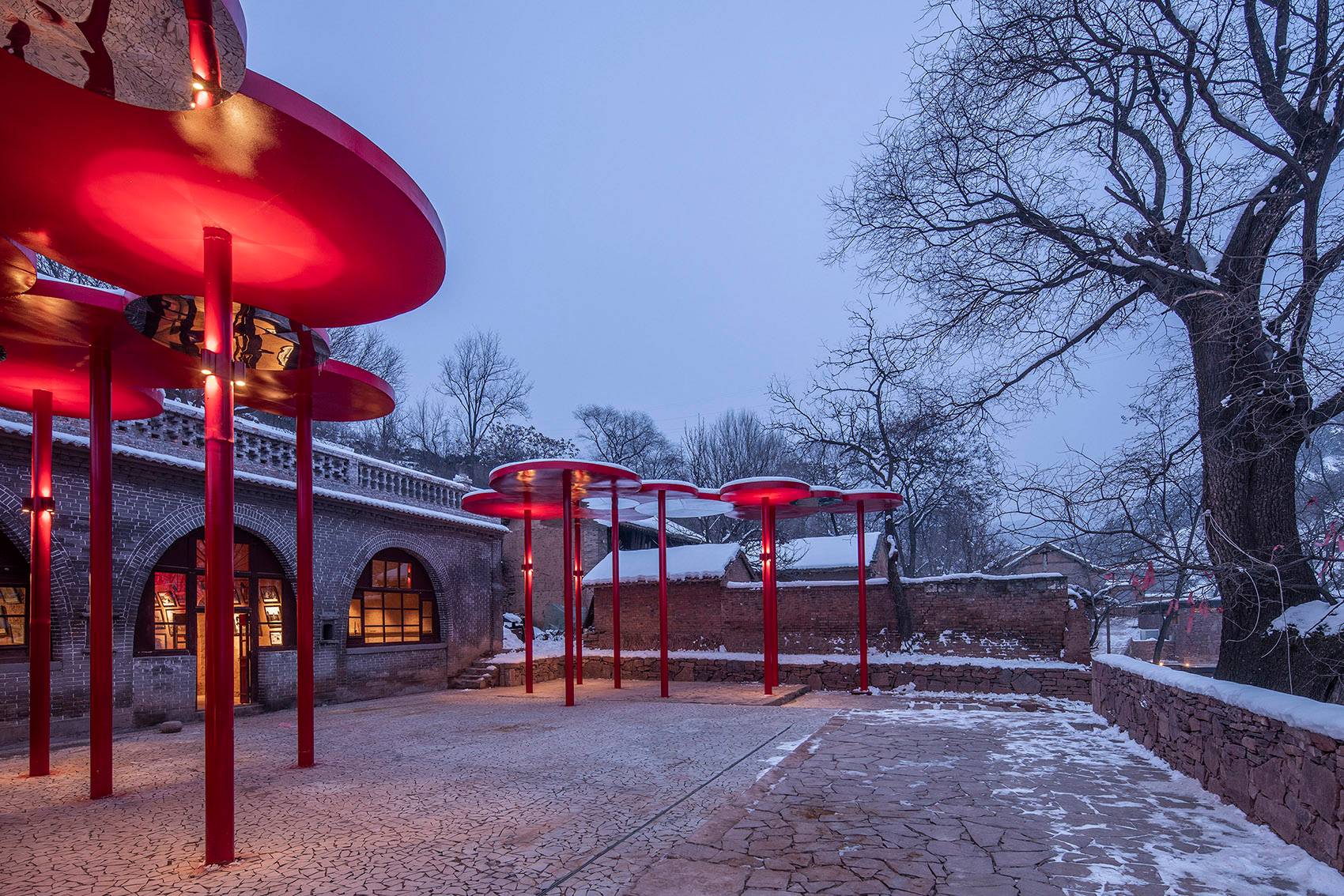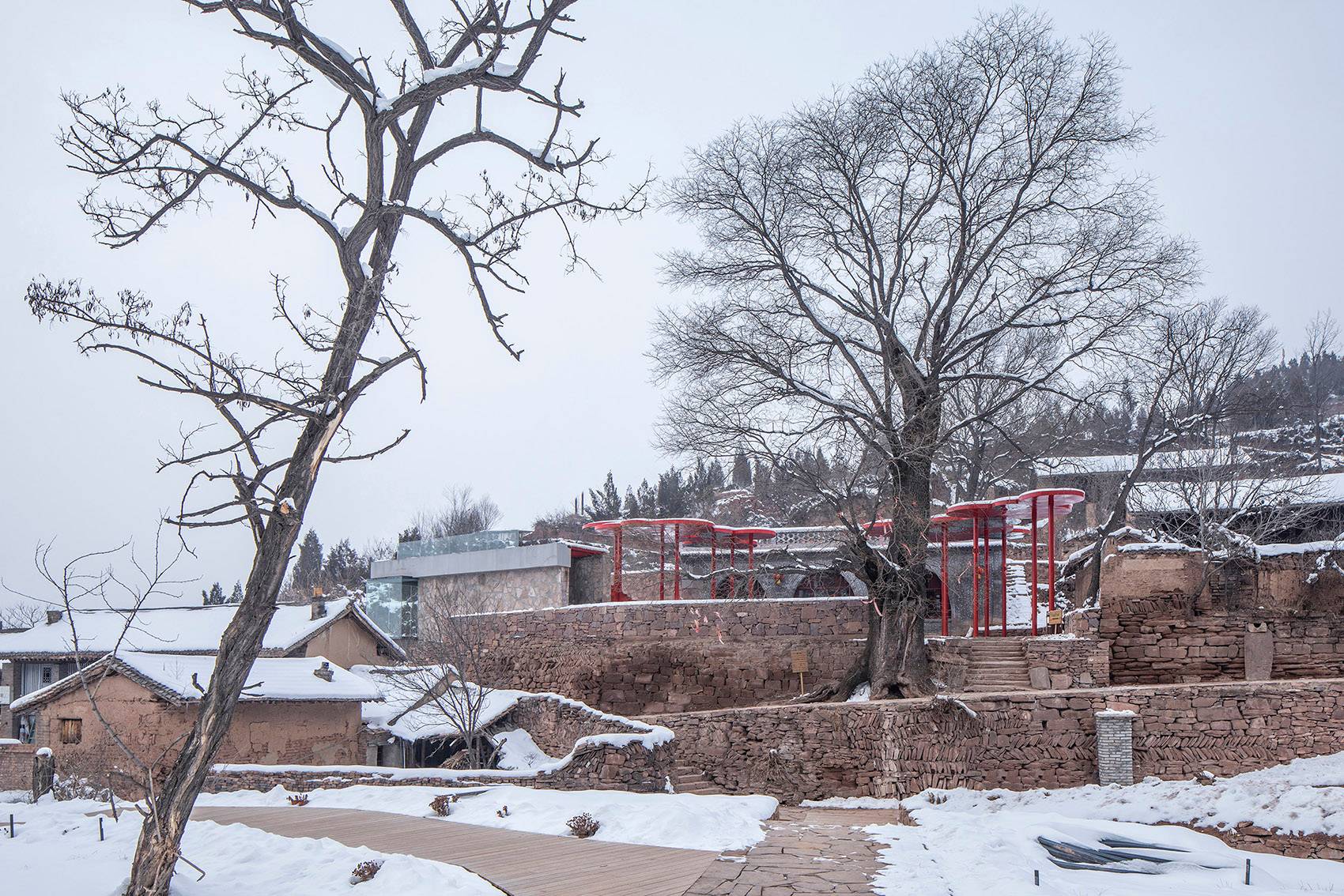 ▲紅色裝置、窯洞與大槐樹一起形成對場地的圍合