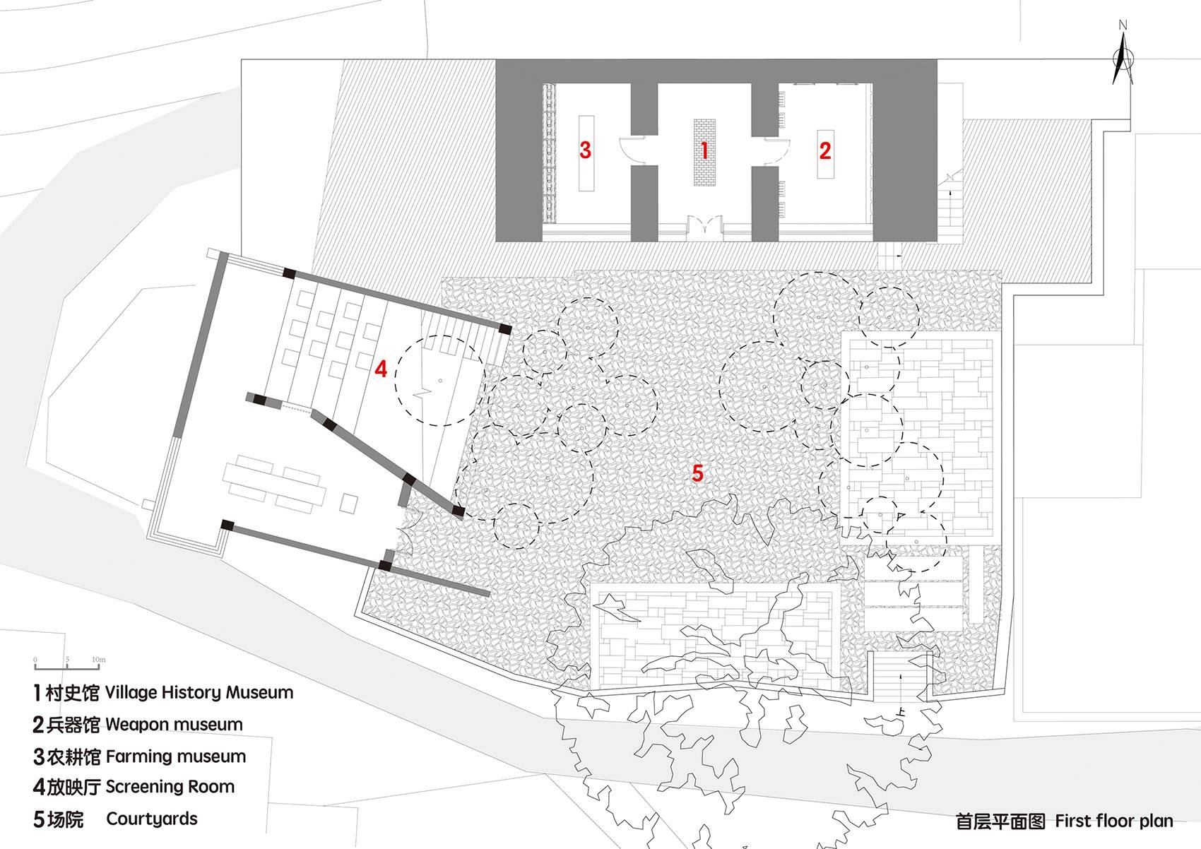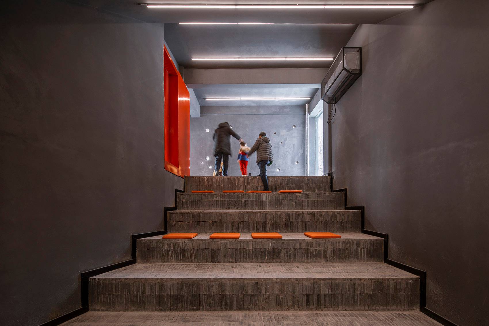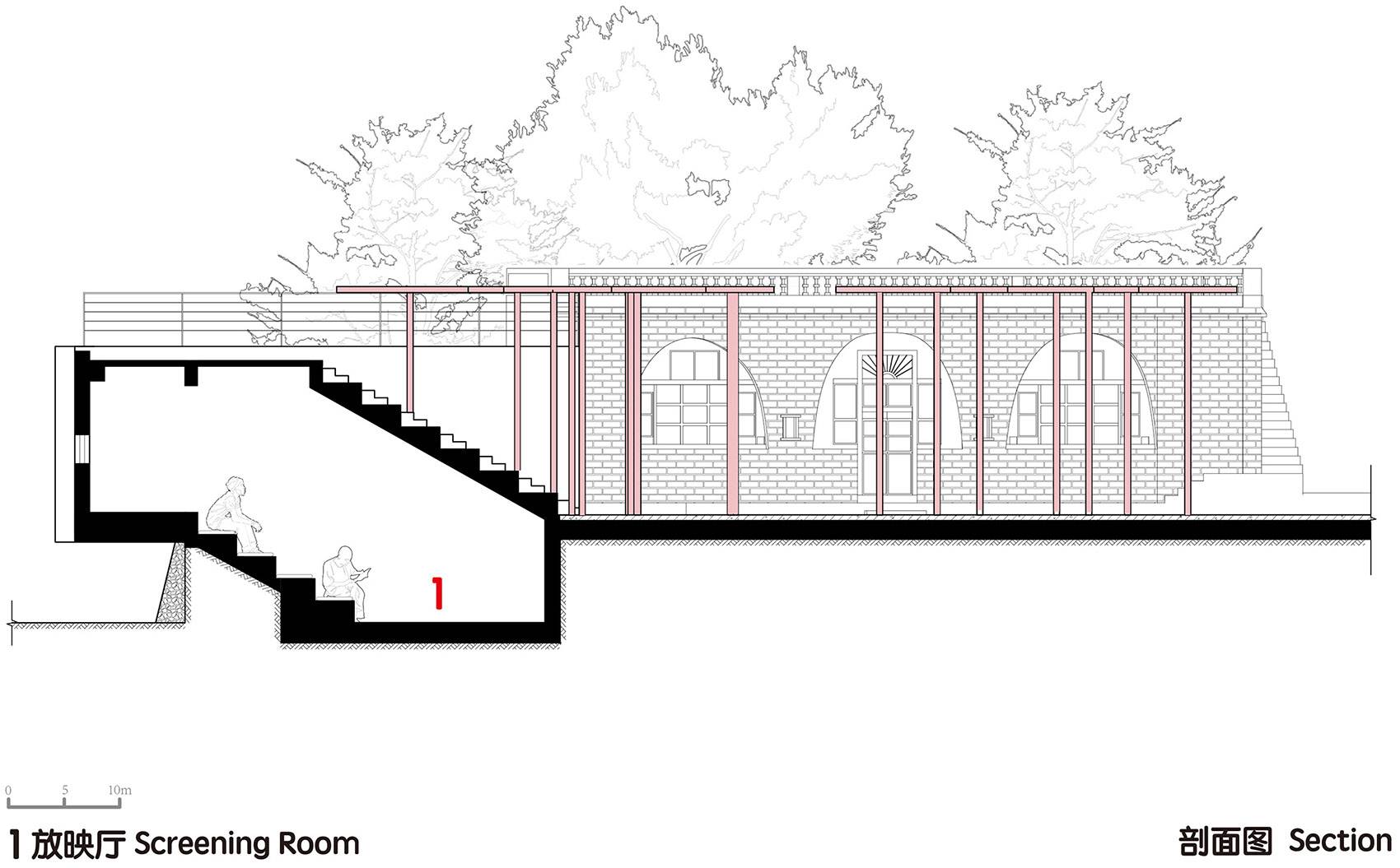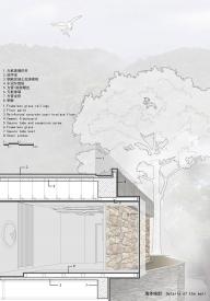 設(shè)計師利用戶外看臺斜向樓板下的室內(nèi)空間設(shè)計了一個下沉式劇場,可以放映電影或者影像內(nèi)容,與戶外看臺功能互補,滿足了北方地區(qū)冬季的室內(nèi)活動需求。小劇場西南側(cè)從場地挑出,落地玻璃和石墻形成的虛實對比進(jìn)一步加強了建筑的視覺性,它為進(jìn)入老村的路徑提供了視覺引導(dǎo)。室內(nèi)劇場、歷史展廳和室外空間一起,形成了新的大槐樹下公共空間,豐富了鄉(xiāng)村的業(yè)余生活,為本地人及未來的新村民提供了文藝活動的場地。