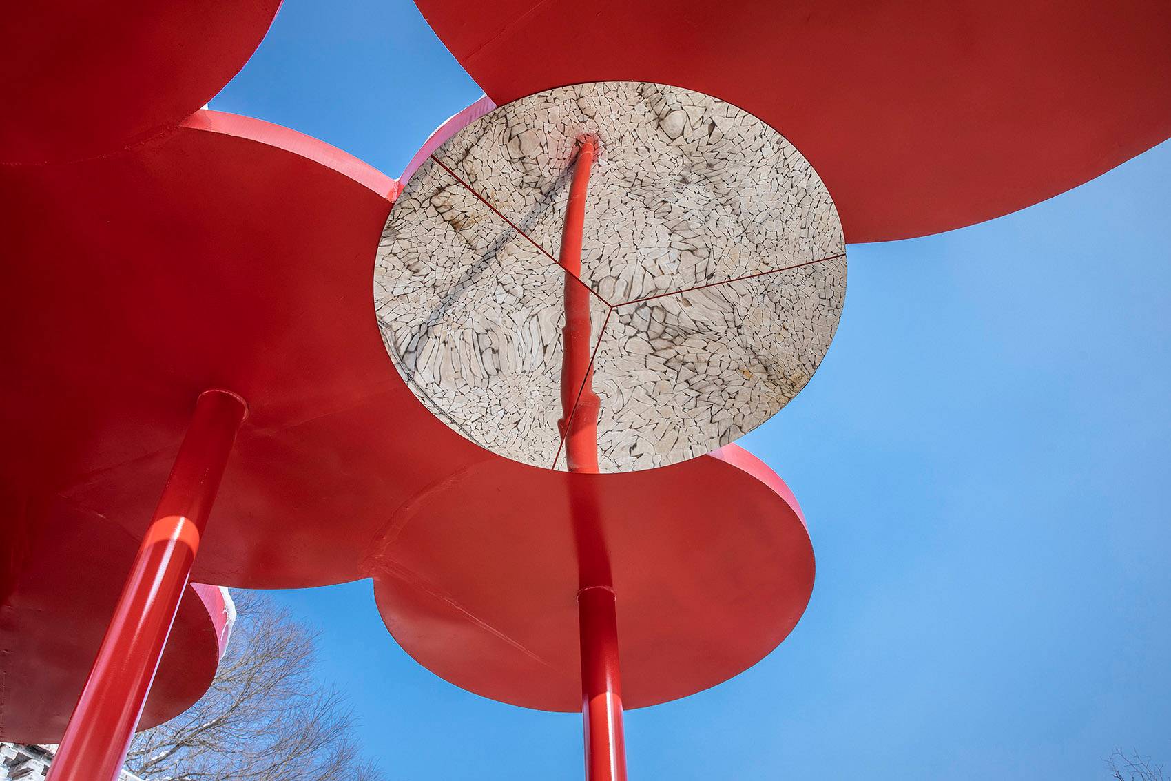 為了進(jìn)一步強化這種藝術(shù)化語言,設(shè)計師在部分圓頂上安裝了反射鏡面。人站立在傘狀構(gòu)筑物下方,可以從反射鏡面中看到自己的影像。自己與自己的對話,使場地更有趣味,更輕松,也更容易引起共鳴。
