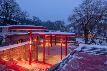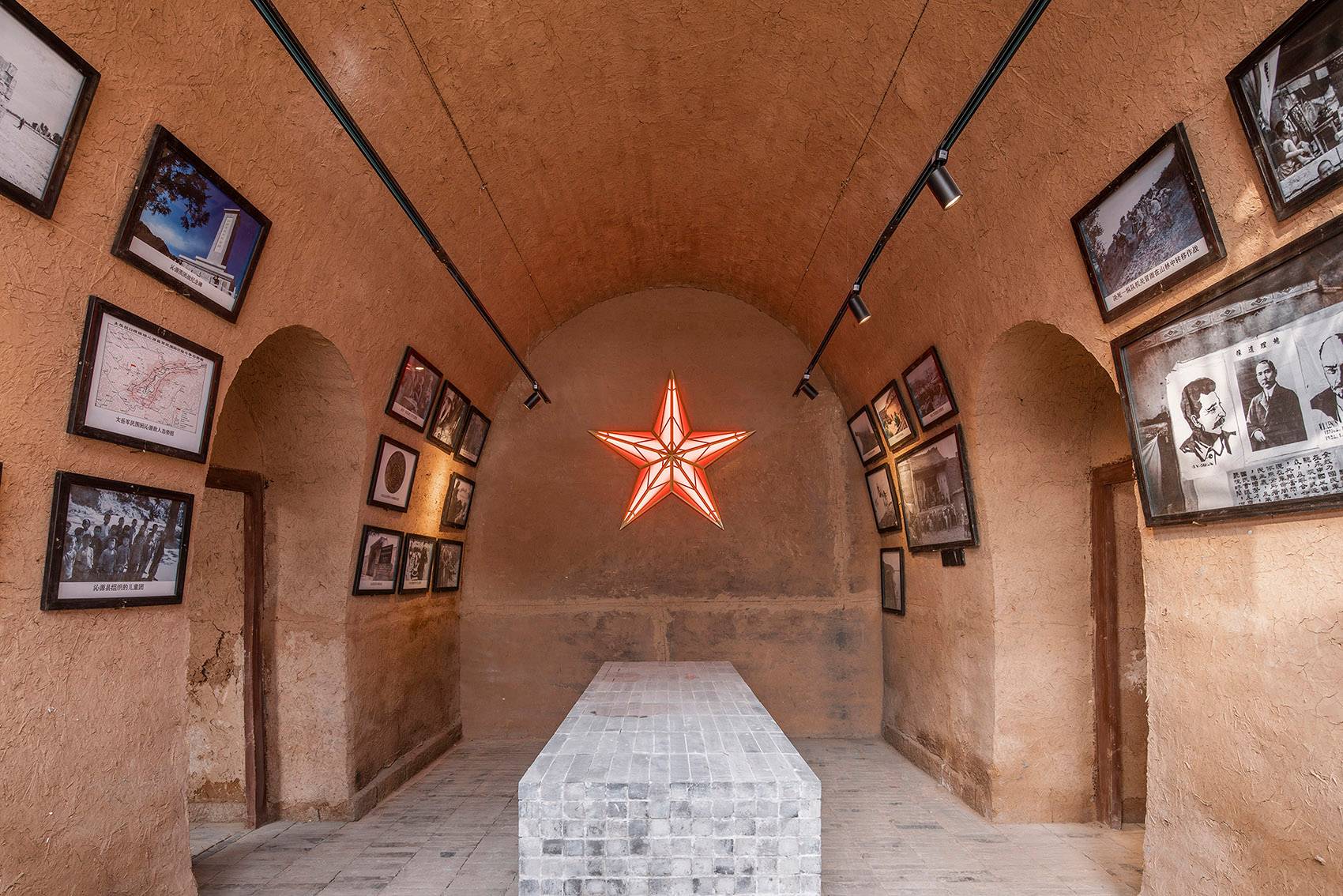 空間中采用了大量紅色元素以產(chǎn)生特定主題的心理暗示,同時又加入了跳躍的材質(zhì)(如傘狀構(gòu)筑物下的鏡面材質(zhì))讓整體氛圍不至于過分嚴(yán)肅。室內(nèi)外兩個劇場空間產(chǎn)生明暗上的區(qū)別,分別對應(yīng)了觀看歷史影像和當(dāng)下表演的不同氛圍需求;村史館窯洞內(nèi)的低矮空間及土墻材質(zhì)被完整保留,定制的五星壁燈裝置,定義了空間的主題,內(nèi)部展陳收集了村內(nèi)的老物件及老照片,使得參觀者可以更真切感受到場地所承載的厚重歷史。