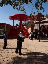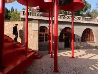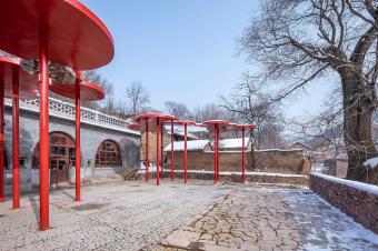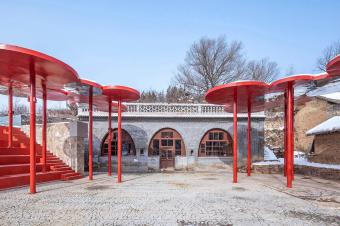 ▲新建的看臺、紅色傘狀裝置與老窯洞