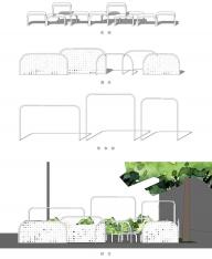 所謂可閱讀就是要以可以理解的故事性把可用的空間組織起來便于使用者的理解和詮釋。所以在這個(gè)設(shè)計(jì)中,我使用了Wutopia Lab最常用的兩個(gè)符號(hào)形式白云和山。白云這個(gè)始于我女兒堂堂四歲詩歌,第一次在古北一號(hào)圖書館使用,象征著飄渺不定但美好事物。這次是將其建筑化變成用于公共空間休憩之用的亭子的屋蓋輪廓線。和綠化相得益彰。山,與之聯(lián)系的就是山水,和云一樣,是中國傳統(tǒng)的基本符號(hào)。Wutopia Lab的山的符號(hào)經(jīng)過六合院,5周年微展到嘉里中心的青綠山水已經(jīng)形成了基本規(guī)制。這次通過對Wutopia Lab的山形符號(hào)的調(diào)整,統(tǒng)一了圍欄,晾衣架和置物架的形式。一組連綿不斷但厚度和透明度不同的裝置既滿足了功能又實(shí)際上變成了一個(gè)層層疊疊屏障的隱喻,形成一個(gè)可以理解的寓言,新建的公共綠地就是白云籠罩下的仙山背后的秘境,它是周圍日漸老去社區(qū)的一個(gè)希望。