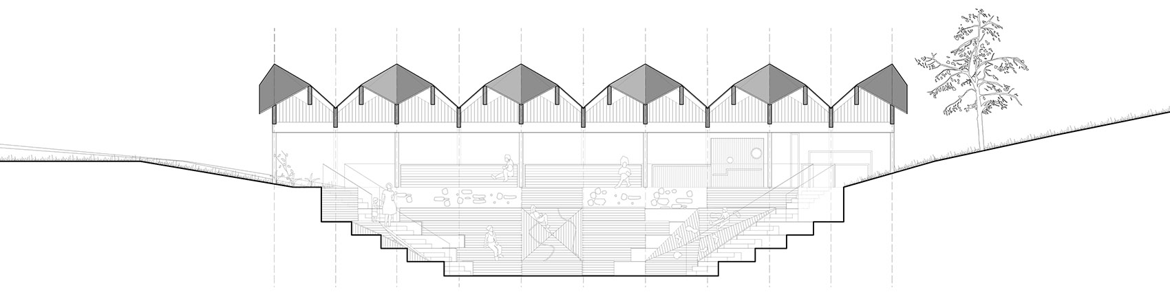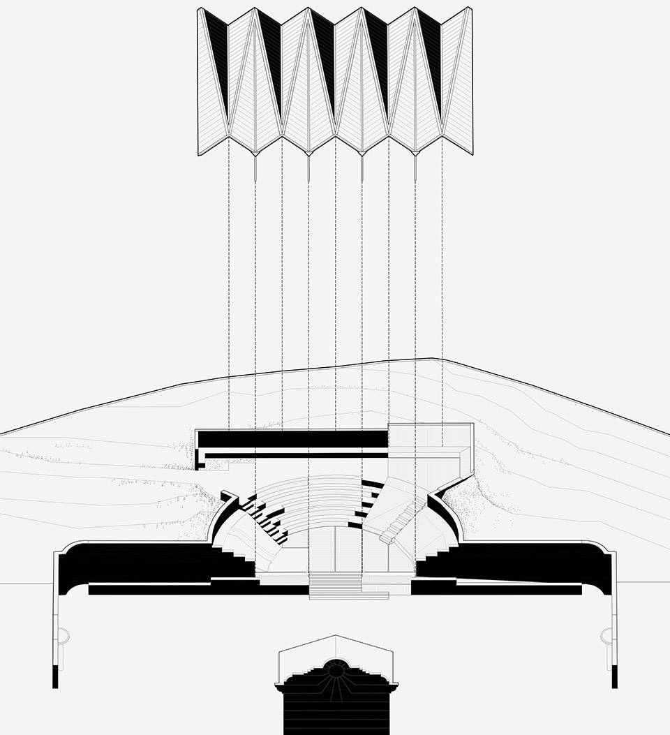 ▲鳥瞰,在室外觀眾席上設(shè)置屋頂,創(chuàng)造新的活動空間