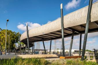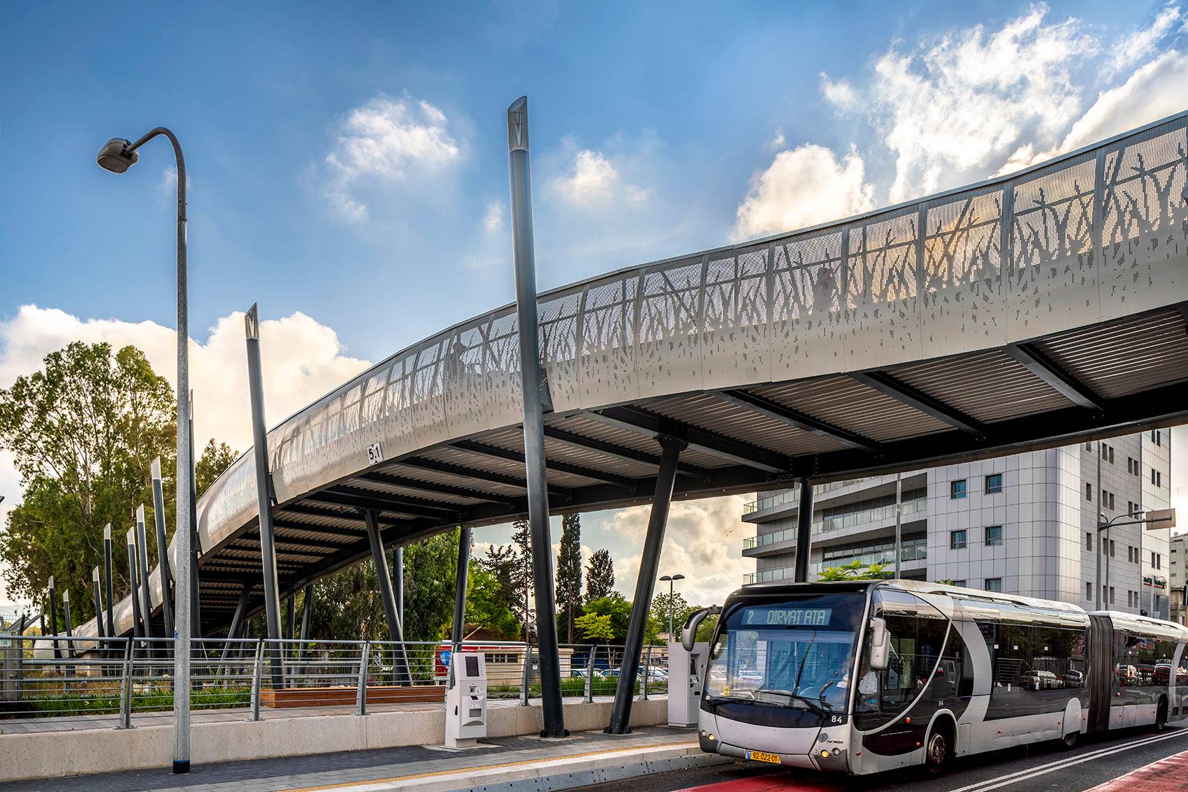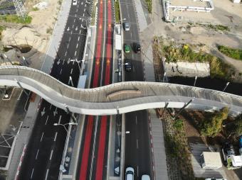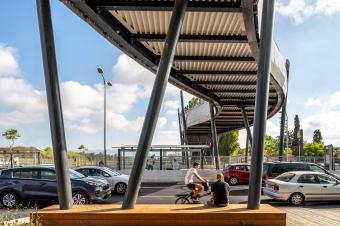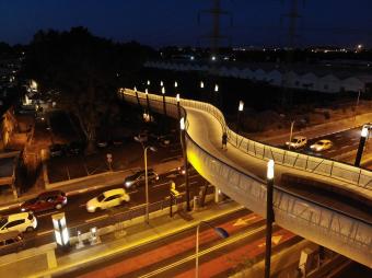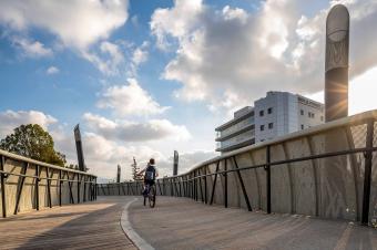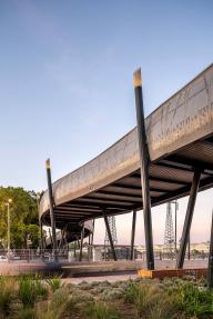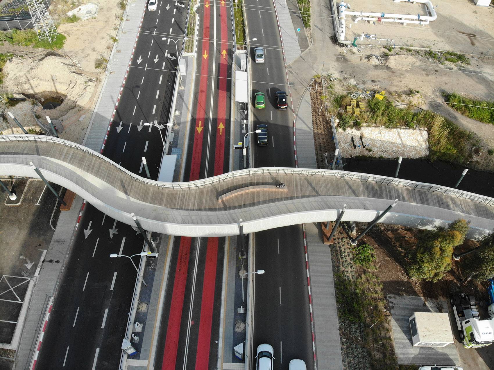 Gdora天橋的跨度高達(dá)220米。行人和騎自行車的人可以從其東南側(cè)通向Kiryat Bialik市的入口進(jìn)入天橋空間,穿過Ha’amakim街,到達(dá)Kiryat Ata。這座天橋與Gdora溪流平行,從地理位置上將兩條規(guī)劃中分別沿著溪流和城市東側(cè)邊界建設(shè)的步道連接了起來。實(shí)際上,本項(xiàng)目可看作是通往Kiryat Bialik市的大門和通道。