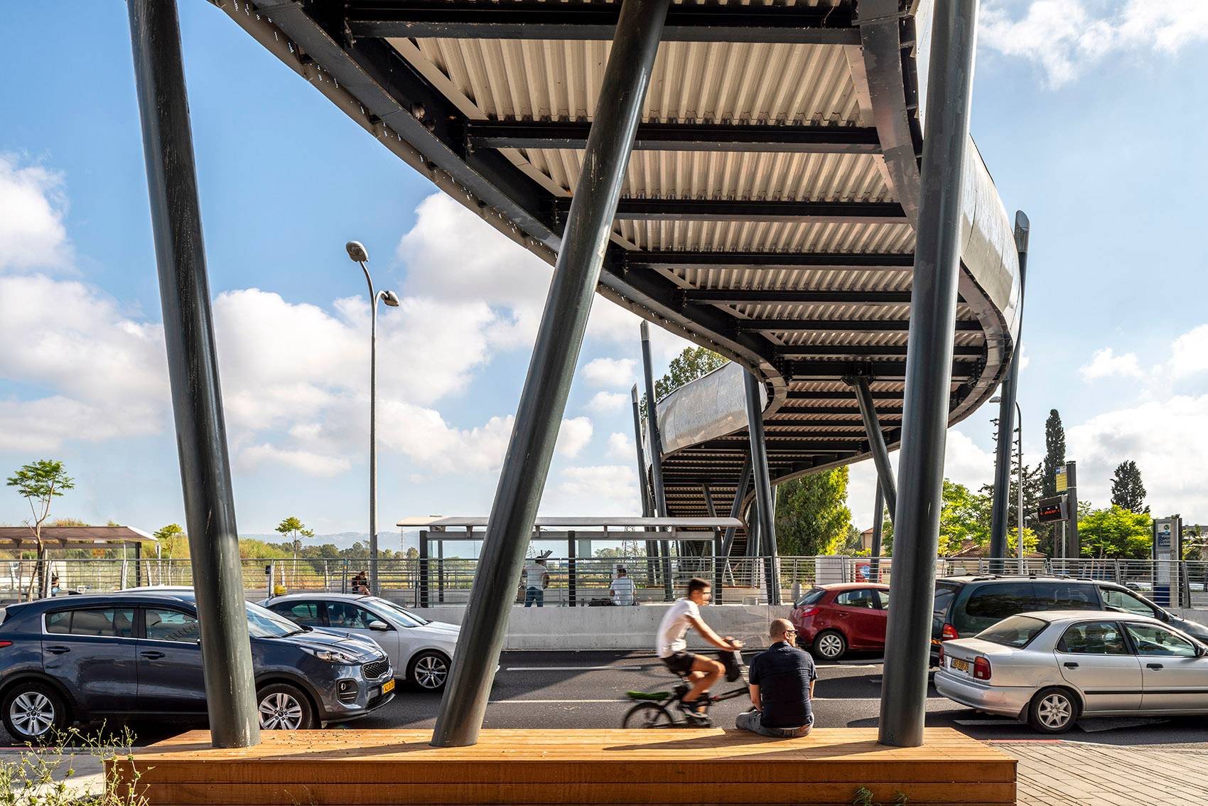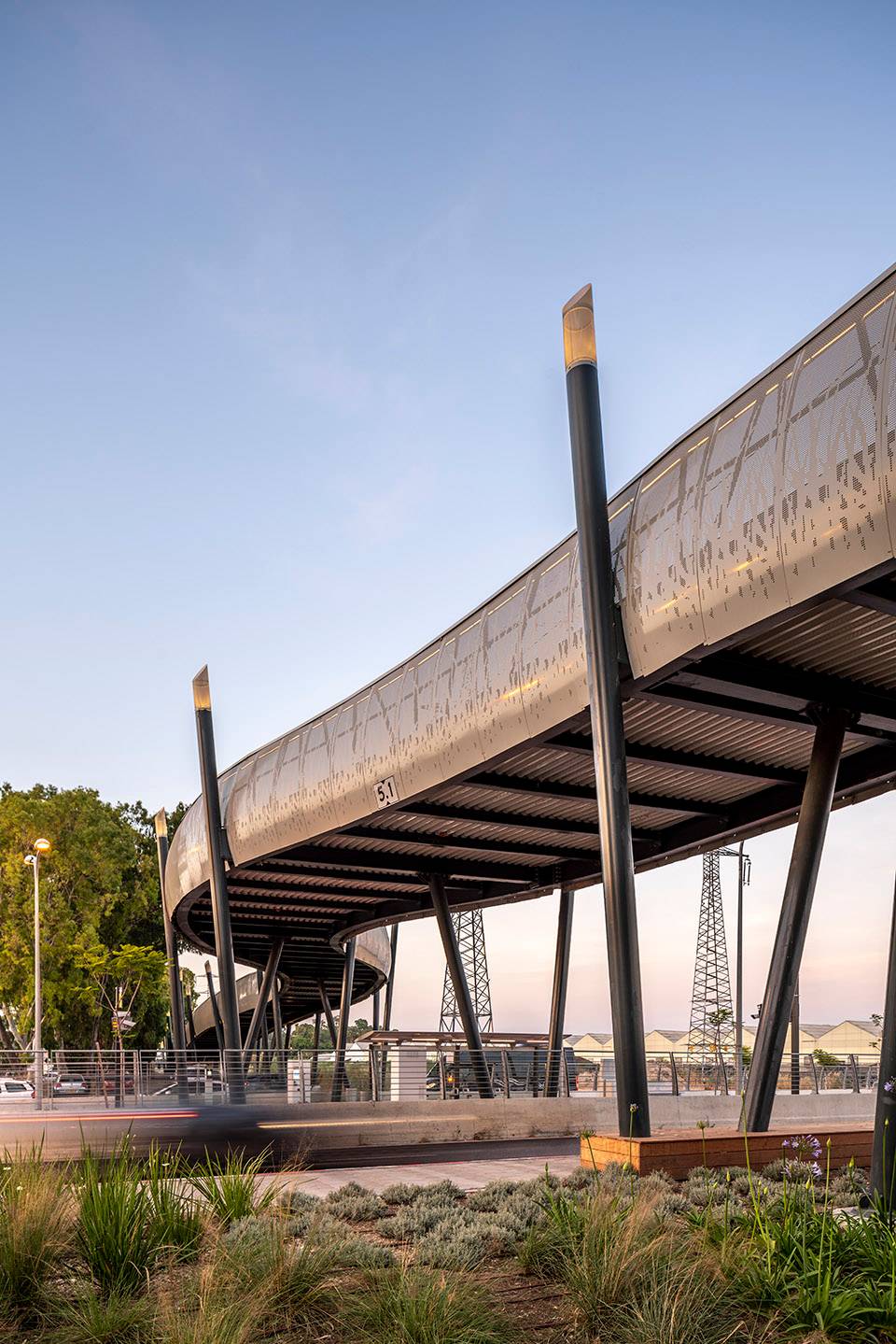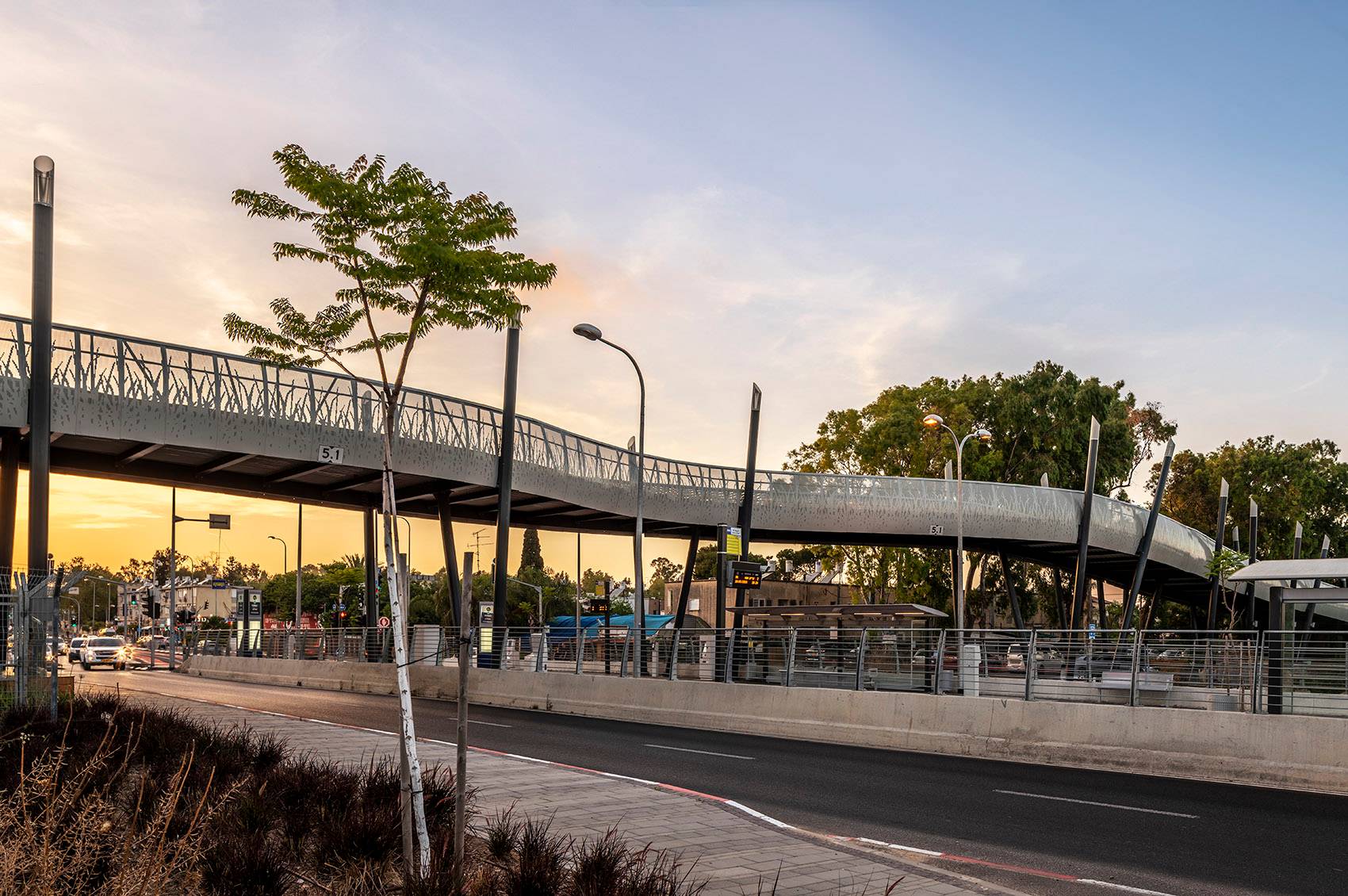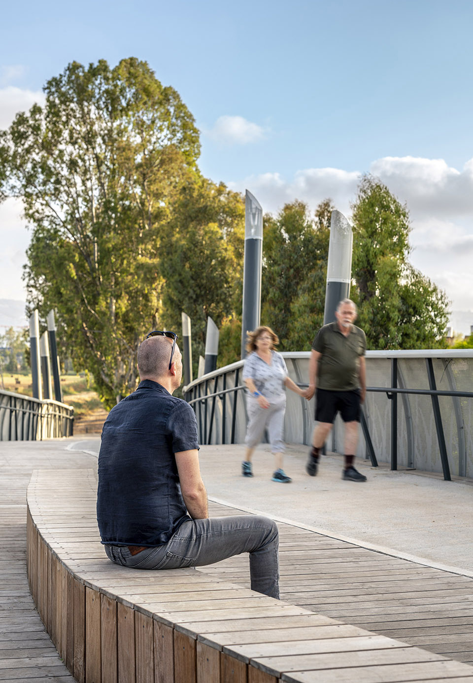 作為Ha’amakim改造項(xiàng)目的一部分,項(xiàng)目基地所在的原有街道被擴(kuò)建為四車道,Matronit電車軌道也橫穿過街道的中心。隨后,建筑事務(wù)所BO Architecture接到委托,在這里建造了一座專為步行人士和騎自行車的人服務(wù)的天橋,并通過這座天橋?qū)⑸衔闹刑岬降牟降肋B接在一起。Gdora溪流一直通向城市周邊的田野里,向南流入基順河(Kishon),經(jīng)過Ha’amakim街道下方的地下通道,隨后匯入街道兩側(cè)的明渠中。值得一提的是,在這些明渠的沿岸遍布著種類繁多的動(dòng)植物群和水生植物,如各種鳥類、無脊椎動(dòng)物和典型的水道植被等。