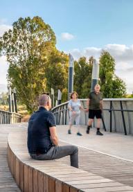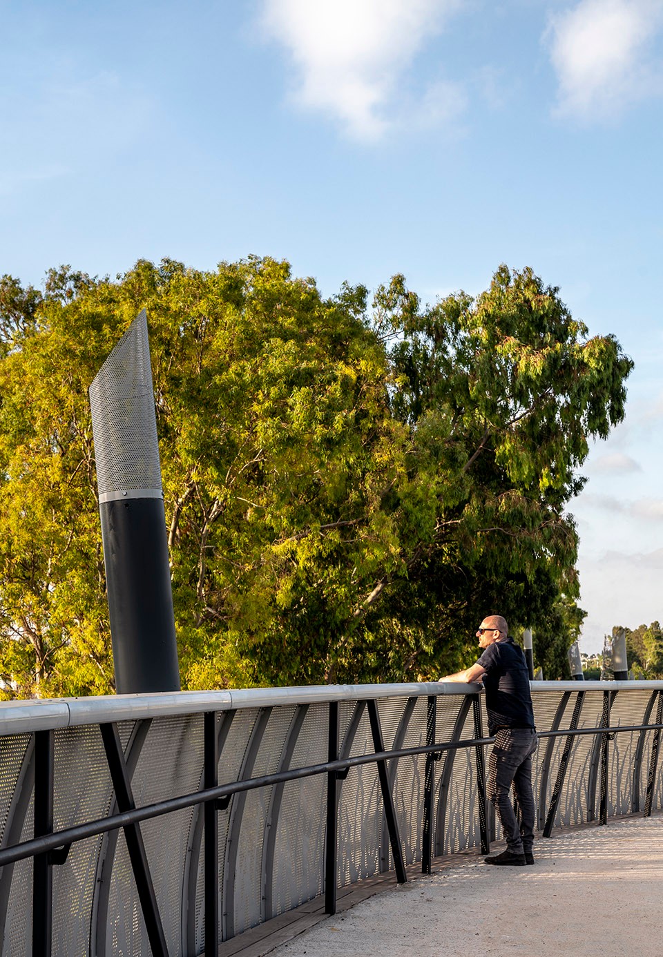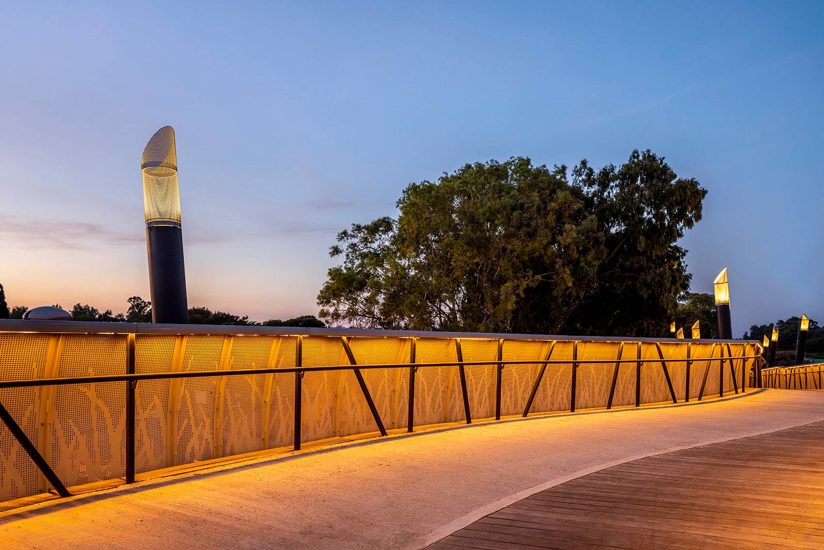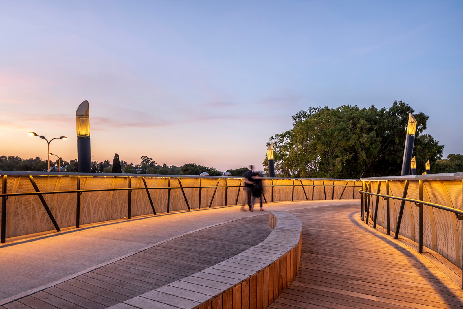 從天橋上通過和從天橋下穿過的體驗(yàn)各不相同,但是這二者都能體會(huì)到由遠(yuǎn)及近靠近這座天橋時(shí)的驚喜。而當(dāng)從白天過渡到夜晚的時(shí)候,在橋上收獲的視覺體驗(yàn)也會(huì)發(fā)生變化。天橋彎曲的造型創(chuàng)造了有趣的步行體驗(yàn)。白天,橋下的桉樹和溪流清晰可見;而到了夜晚,在扶手和細(xì)柱頂端中的燈光就將天橋變成了一條光之通道。