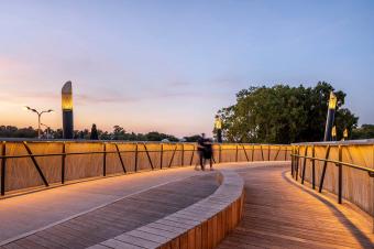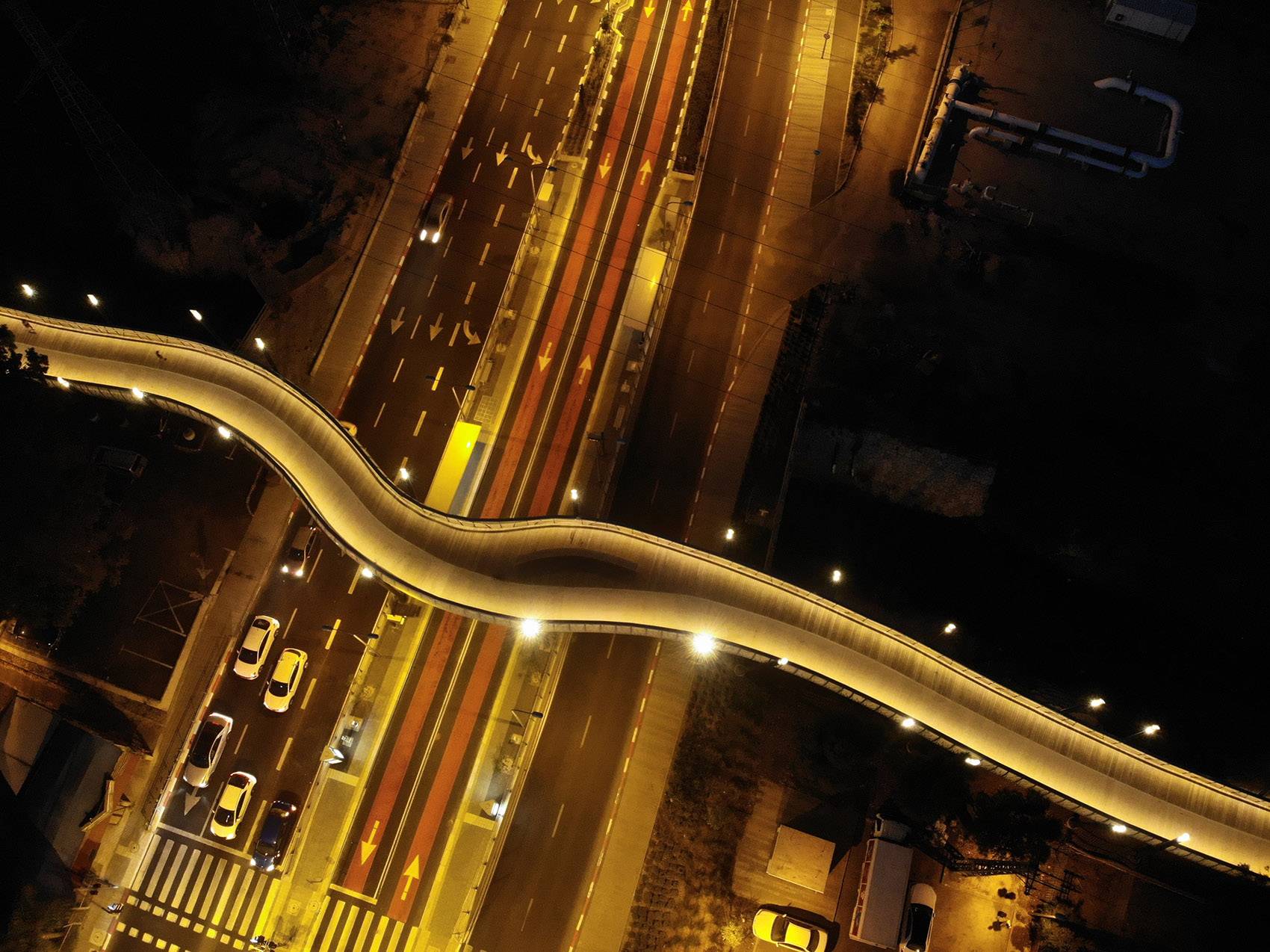 ▲到了夜晚,在扶手和細(xì)柱頂端中的燈光將天橋變成了一條光之通道