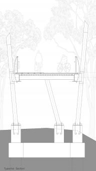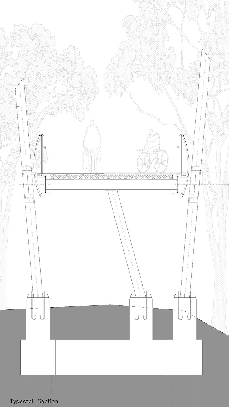 Gdora溪流的歷史軸線受土壤類型和水量的影響。因此,水體進(jìn)入河道之前的蜿蜒曲折的路線就成為了本天橋設(shè)計(jì)的基礎(chǔ)。設(shè)計(jì)團(tuán)隊(duì)希望能夠保留所有古老的桉樹,因此他們決定按照水道的走勢(shì)來設(shè)計(jì)天橋的形式。而這就意味著橋梁需要根據(jù)現(xiàn)場(chǎng)的情況進(jìn)行適當(dāng)?shù)奈恢门まD(zhuǎn)。
