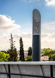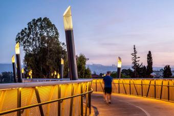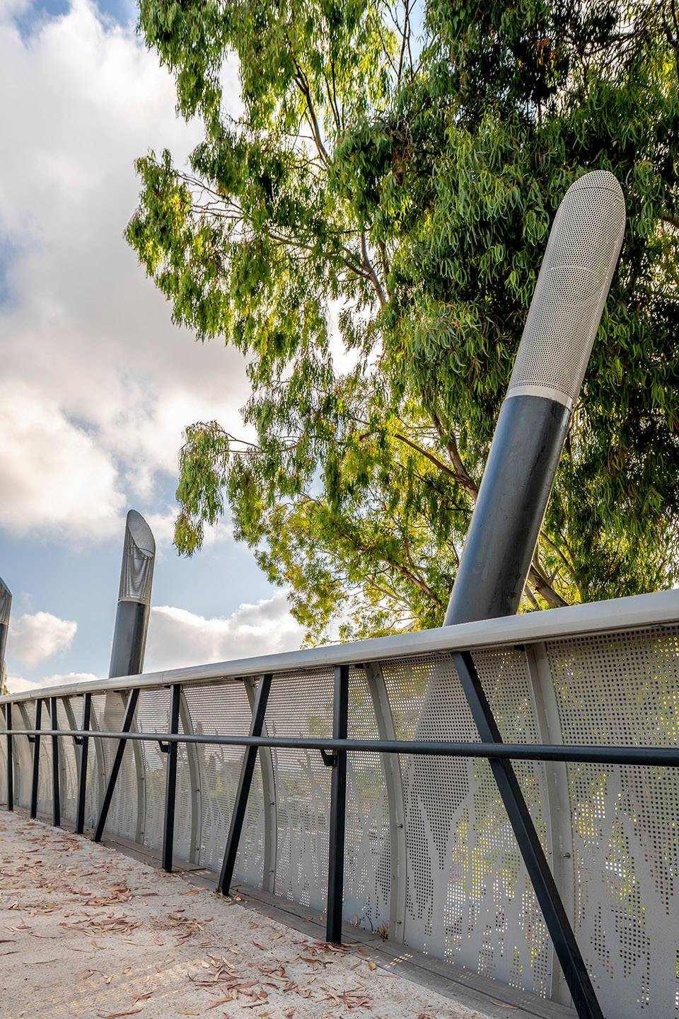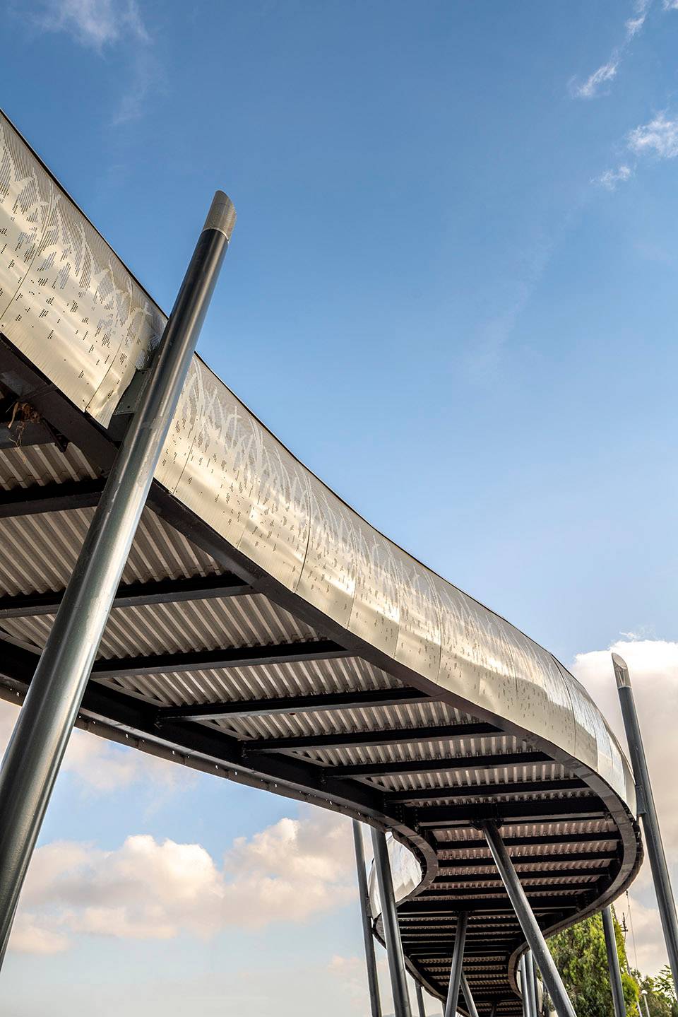 當(dāng)Ha’amakim街上的駕駛員距天橋尚有一定距離的時(shí)候,這座天橋就像是纏繞在傾斜細(xì)柱上的金屬蛇。仔細(xì)觀察,還能看到扶手欄桿的外表皮。到了晚上燈光亮起的時(shí)候,天橋就像是遠(yuǎn)處的燈火一樣引人注目,細(xì)柱上的燈光仿佛漂浮在空中的螢火蟲。當(dāng)人們靠近的時(shí)候,他們便會(huì)感受到朦朧的燈光氛圍,并辨認(rèn)出扶手欄桿外表皮上的圖案內(nèi)容。