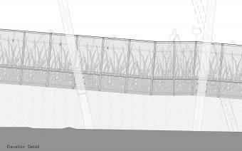 ▲欄桿扶手的外表皮由帶有河床植被圖案紋理的金屬錫穿孔板構(gòu)成