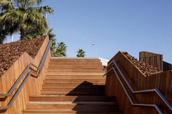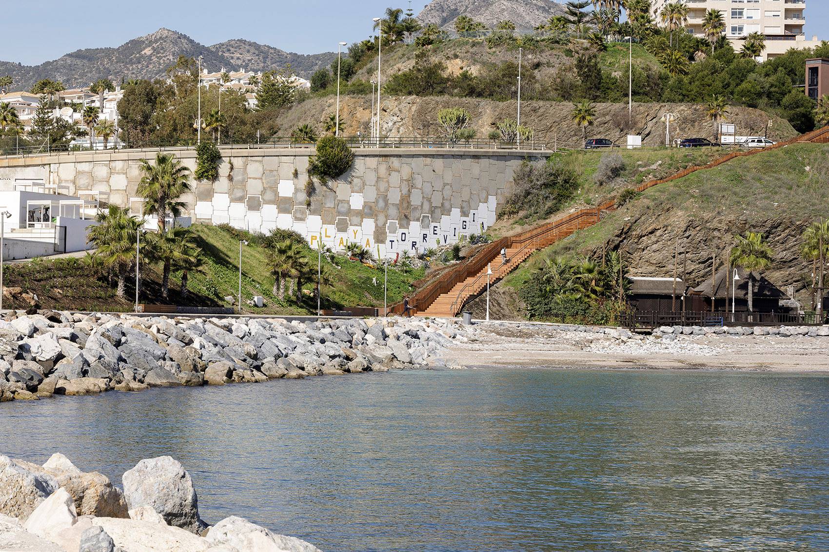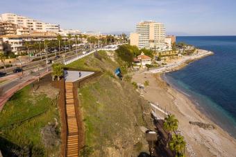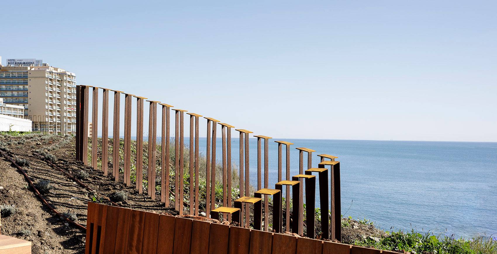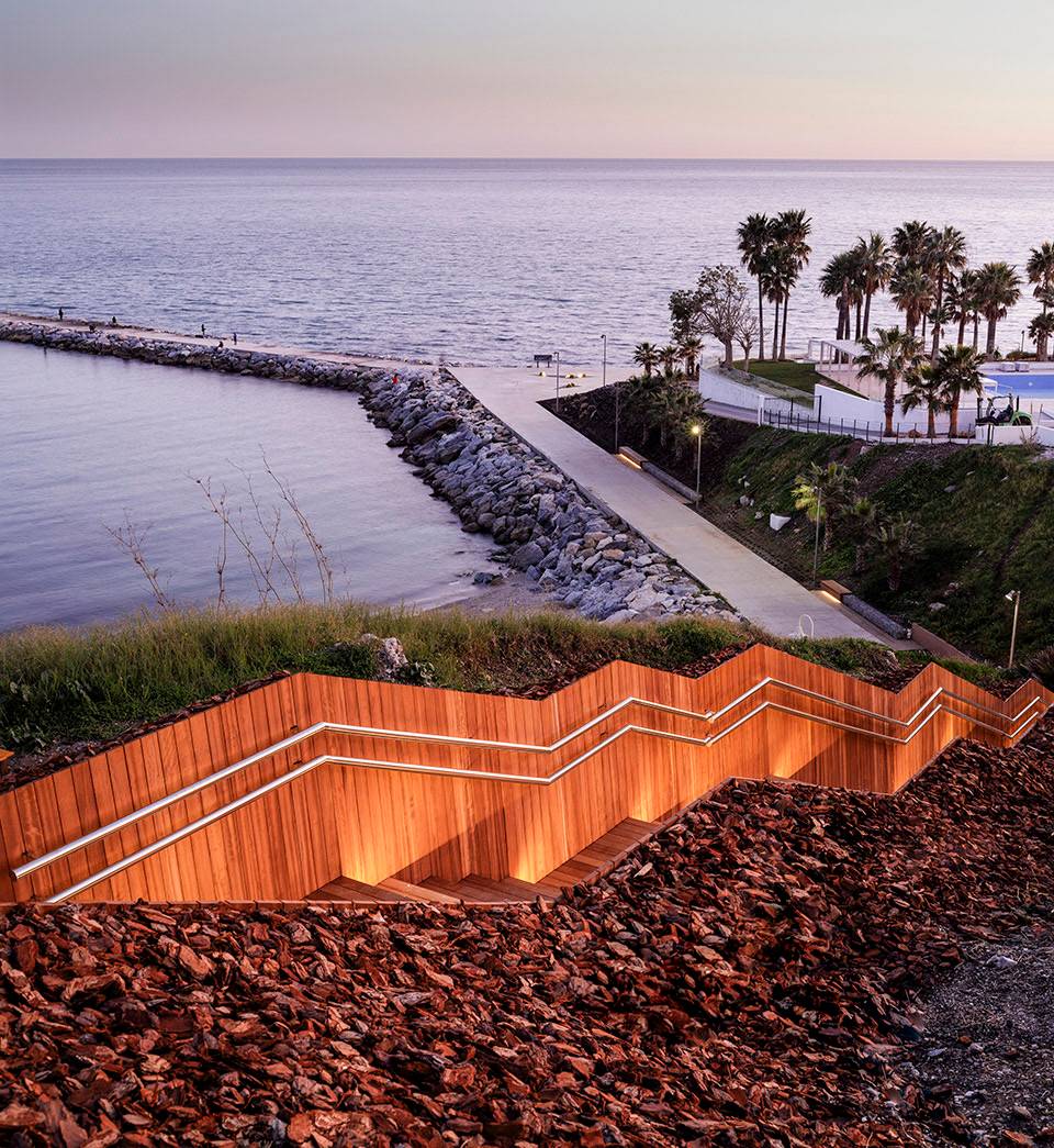 在項(xiàng)目的入口處可眺望到地中海的景色。嵌入山坡的臺階連接起Antonio Machado大街與Torrequebrada濱海大道,消解了兩者之間巨大的高差。