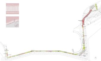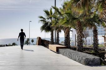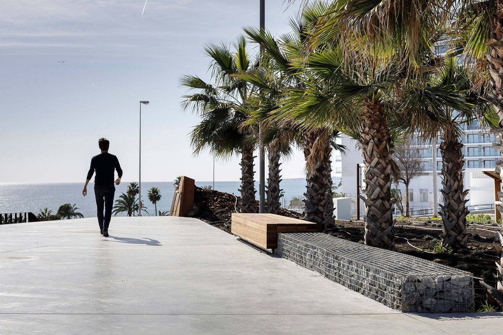 項(xiàng)目場地連接了Torrevigía海灘和Torrequebrada海灘,項(xiàng)目實(shí)施策略除充分尊重場地自身的景觀條件外,還重點(diǎn)關(guān)注了場地區(qū)位。場地內(nèi)的游線被劃分為軟性景觀帶及硬性景觀帶。軟性景觀帶中包含地中海植物景觀及城市家具和照明設(shè)備,從而在酒店群及濱海大道之間形成緩沖空間。游客可以在不同的景觀空間中冥想,休息或躺下享受陽光。硬性景觀帶主要服務(wù)于騎行及體育鍛煉。