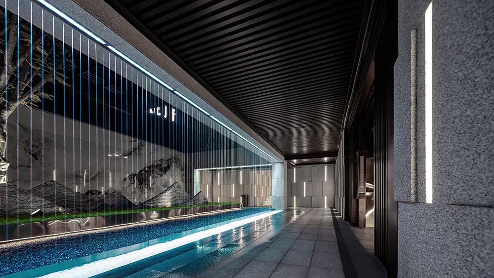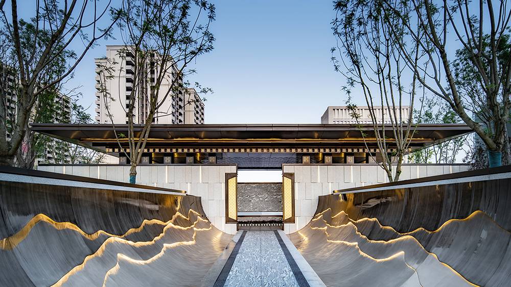 景觀規(guī)劃沿襲內(nèi)江人文,以府院、山水為基調(diào),依托歷史文化與城市印象。循著項目中天然的高低起伏,采用借勢造景的手法,同時融合大千故里濃厚的藝術(shù)文化,以沱江水作為設(shè)計來源。問渠那得清如許?為有源頭活水來。取水之“靈動”,大面積地運用天然水景營造空間的山水之境。