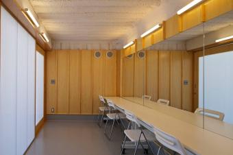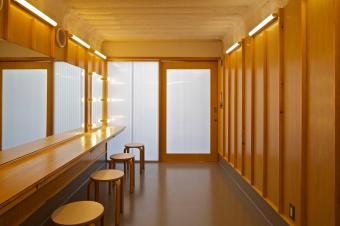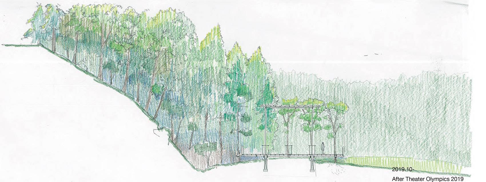 該劇場被指定為“2019劇場奧林匹克(Theater Olympic 2019)”國際戲劇節(jié)的場地之一。為了更好地服務這一國際活動,設計團隊需要在劇場的周圍建造一系列附屬設施,例如半圓形階梯頂部的舞臺燈光架和階梯后方的演員更衣室等。更衣室由海運集裝箱改造而成。