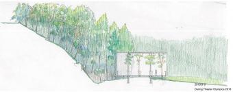 按照不同的劇場表演配置,上文所提到的三個空間元素能夠組成三種不同的空間形式。第一種布局是將半圓形的階梯作為觀眾席,將圓形平臺和緩坡草坪作為舞臺。這種布局可以容納300位觀眾。廣闊而深遠的草坪配合著地面的高差,也會帶給觀眾一種獨特的動態(tài)視覺效果。