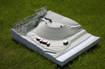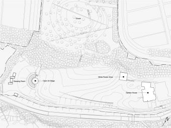 第二種布局是將半圓形階梯和圓形平臺作為舞臺,將緩坡草坪作為觀眾席。第三種布局則是只將圓形平臺作為舞臺,將剩下的階梯空間和草坪空間都作為觀眾席,這也是所謂的葡萄園庭院式布局。此外,這個露天劇場空間也非常適合大型的音樂演出,尤其是在后兩種布局的情況下,這里最多可容納一千多名觀眾。這個圓形露臺劇場已由建筑事務所A.P.L. design workshop于1989年完成。