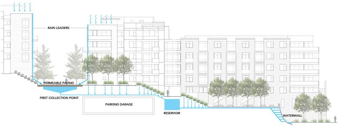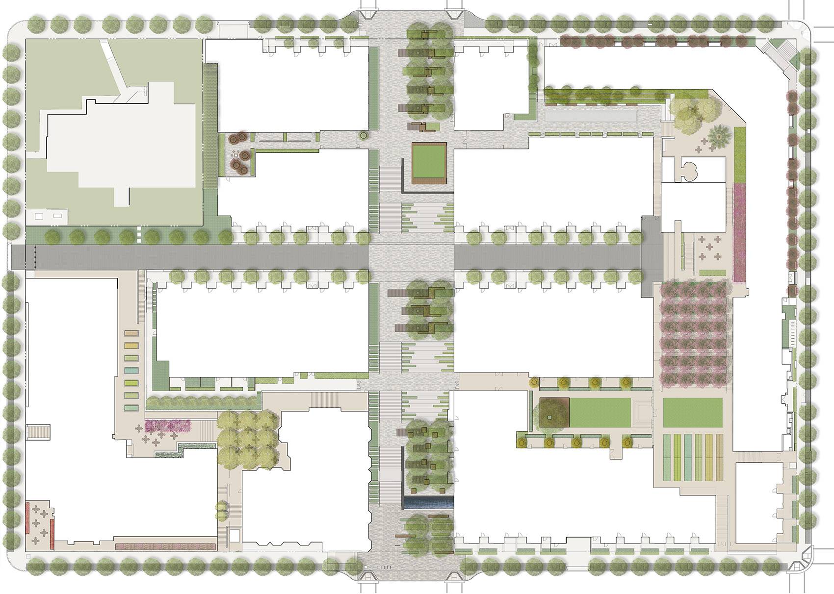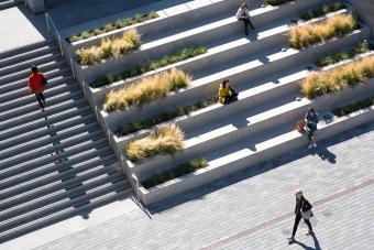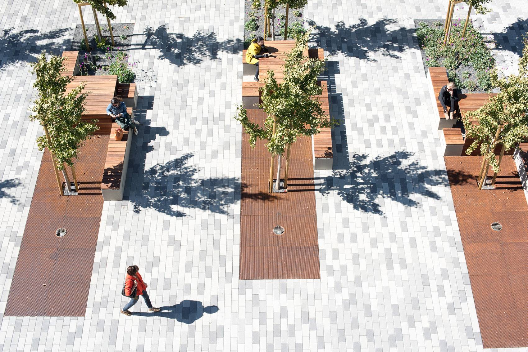 大部分的景觀被支撐在結(jié)構(gòu)之上。地下停車場被壓低至距地表6英尺(約1.83米)處,為的是支撐懸臂式的路徑,維護(hù)不密實的可滲透土壤環(huán)境,從而讓銀杏樹林得以生長繁衍。